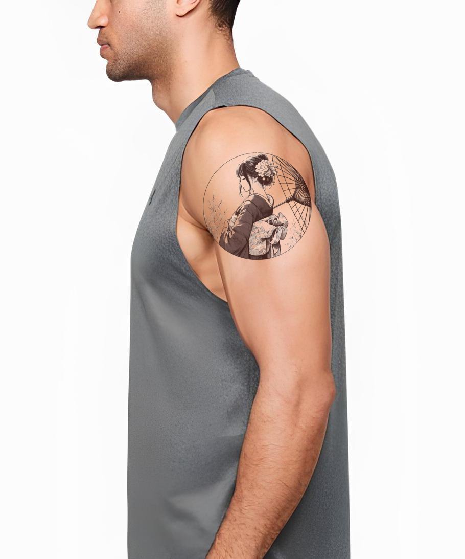 沉浸在这款黑灰色纹身设计的精致优雅中。灵感来源于传统日本艺术,这个设计展示了一个女孩的崇高美感,散发出一种超凡的魅力。传统与优雅的完美结合,这款纹身将为你的个性注入永恒的精致感。