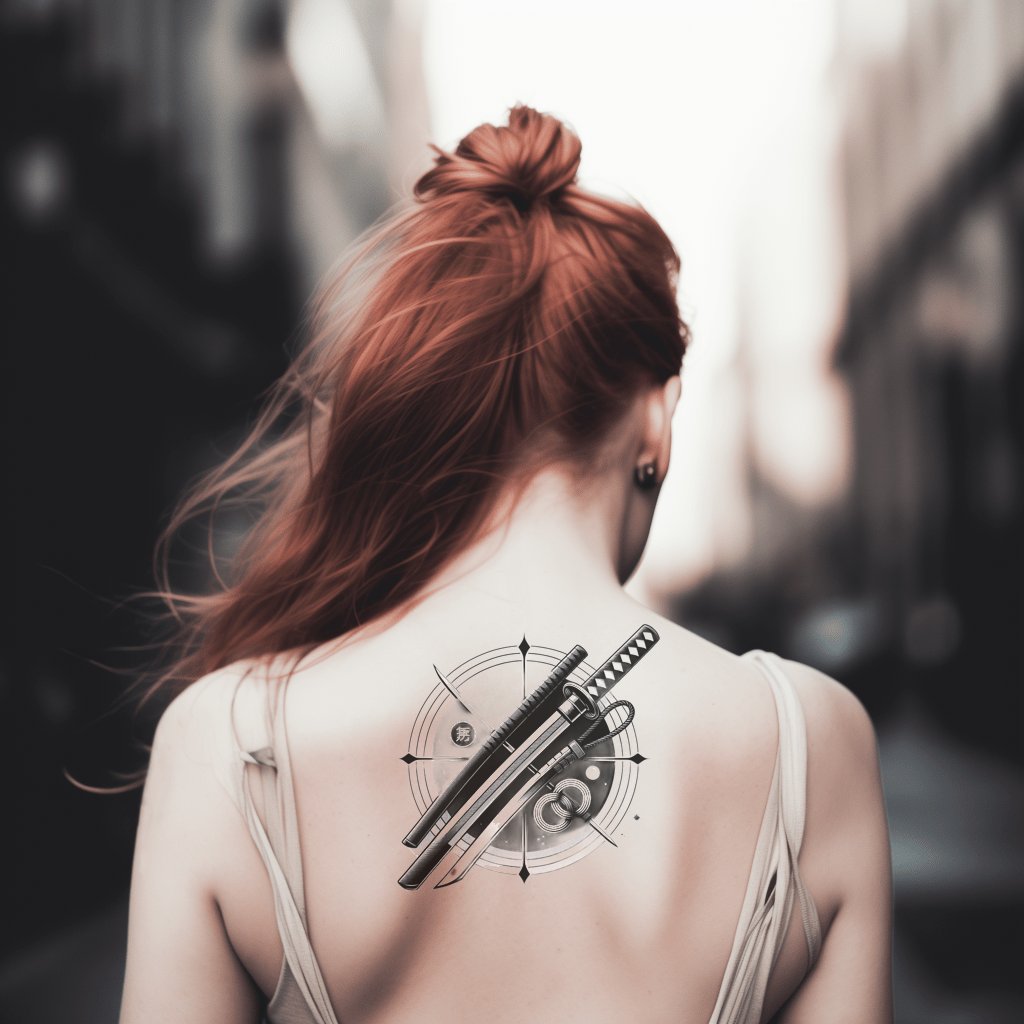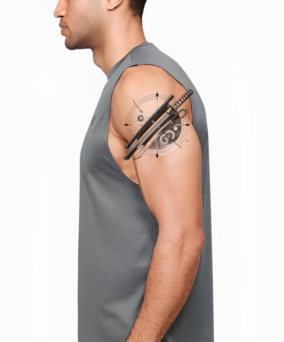 体验武士的勇气,这款传统的日本纹身设计。黑灰色的阴影捕捉了武士刀的动人美感,象征着勇气和战争。用这件引人注目、艺术精湛的纹身作品唤醒你内心的战士精神。
