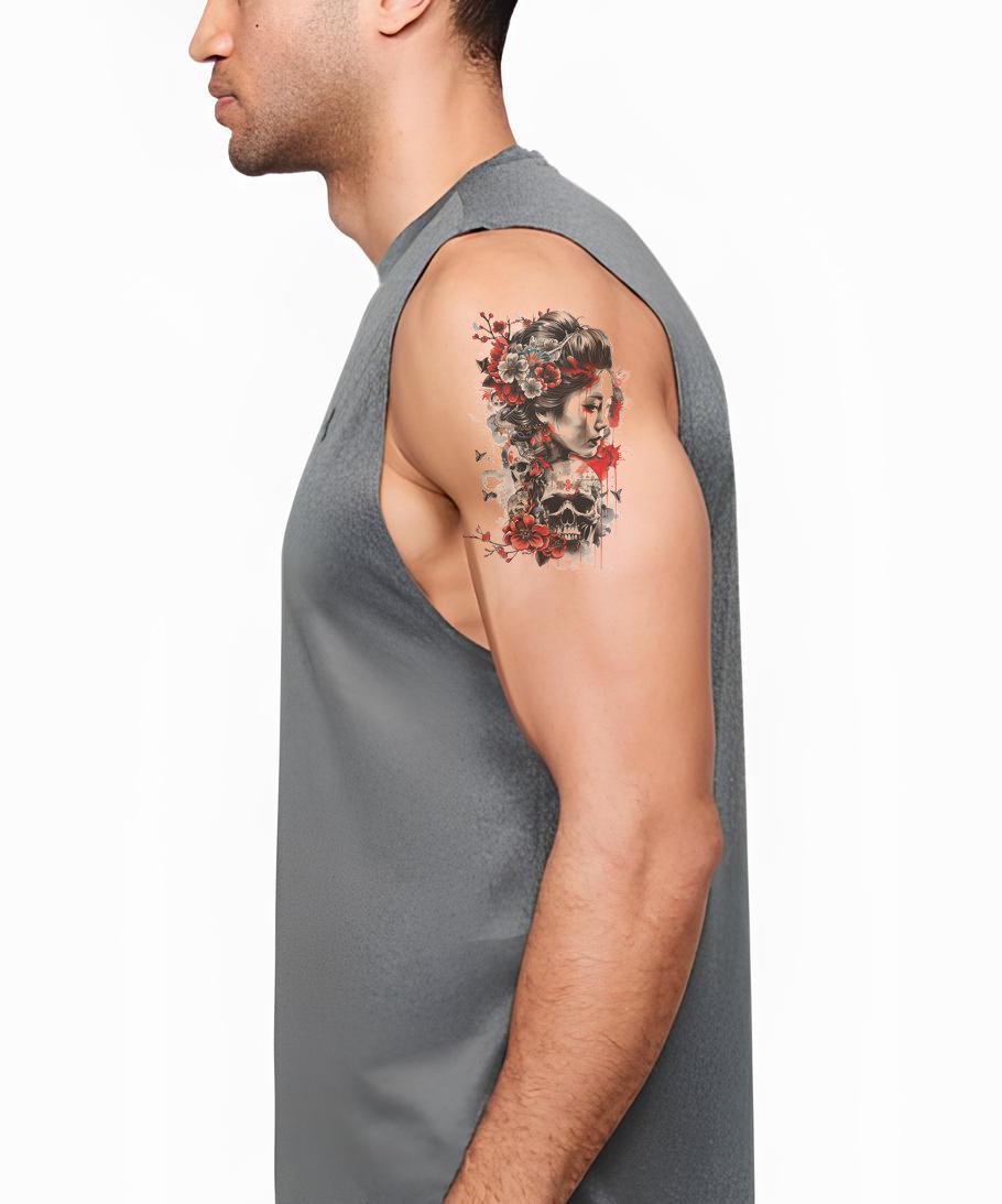 沉浸在东方的神秘中,欣赏这款传统的日本纹身设计。设计中有一位面带骷髅的美丽艺伎,置身于宁静的樱花之中,周围点缀着精致的蝴蝶。这是一件体现生命、女性气质和短暂美丽复杂层次的标志性作品。适合大胆之人的杰出艺术品。