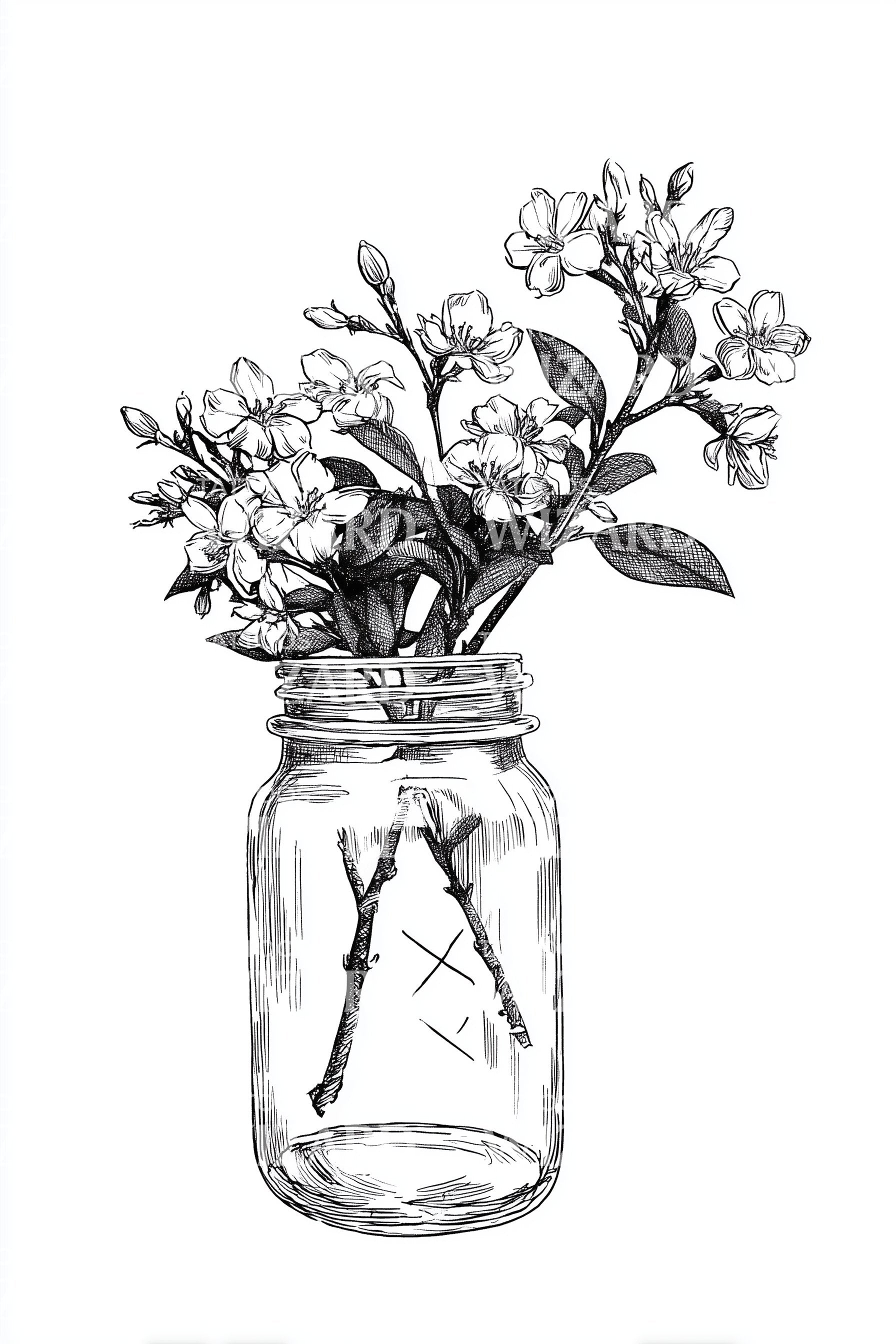 用我们的细线风格梅森罐设计提升您的纹身收藏,这是一种植物与自然主题的独特融合。沉浸于野花的精致细节,欣赏这只装满花朵的精美罐子的细腻美感。非常适合追求自然优雅气息的人士。