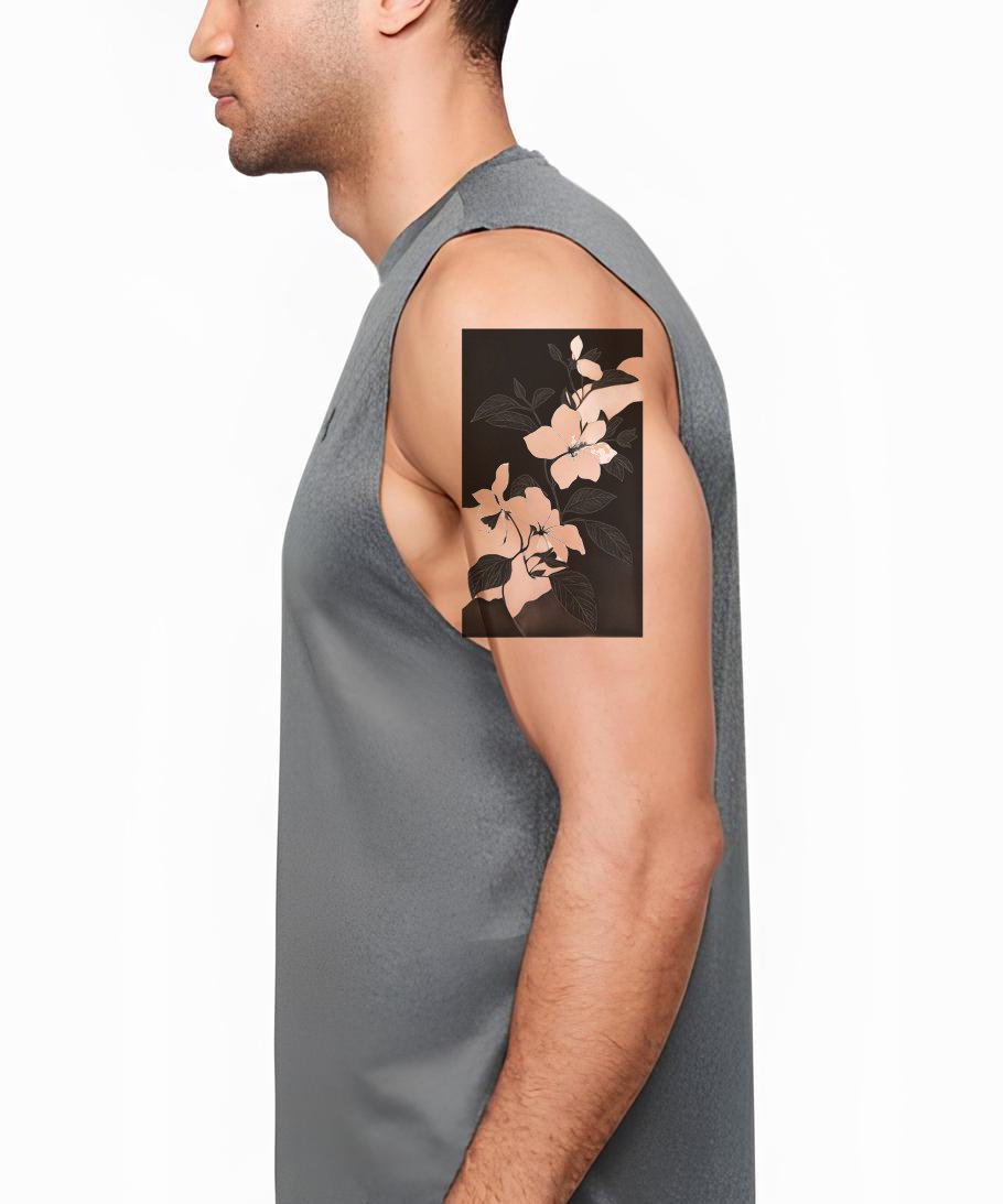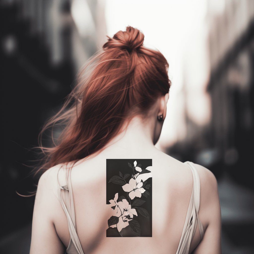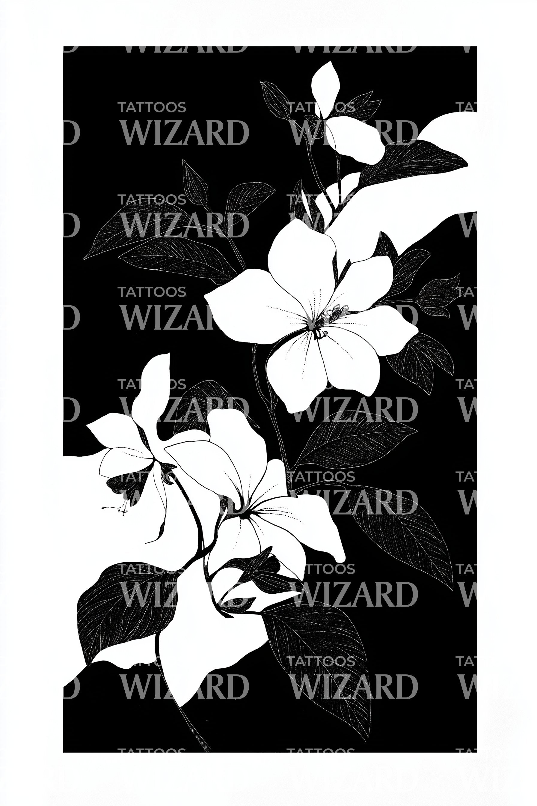 这款极简黑色纹身设计以茉莉花的醒目剪影为特色。其流畅的花卉图案散发出简约与优雅。黑色的对比色调营造出前卫而又精致的效果,是独特极简纹身艺术爱好者的理想之选。