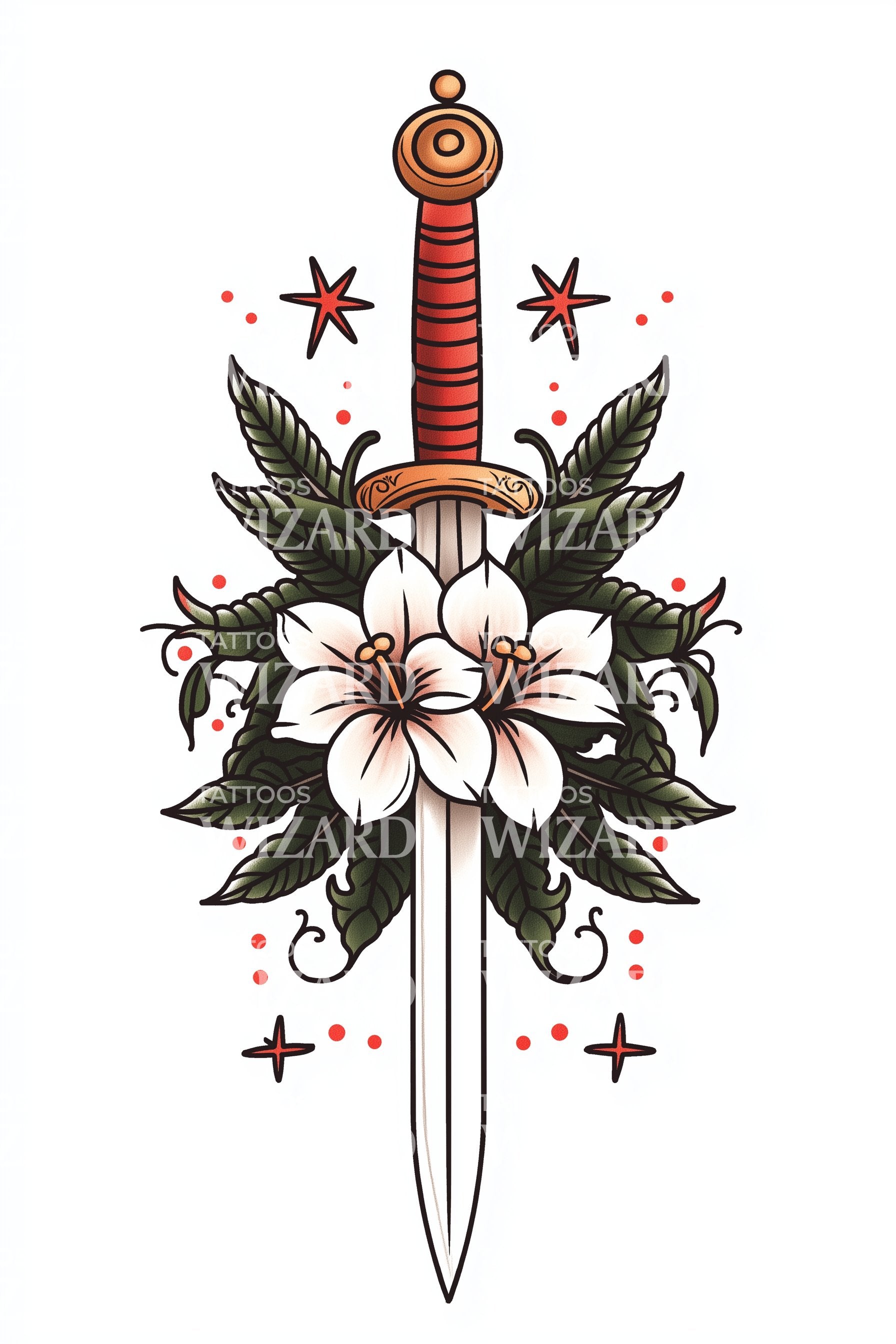 拥抱你那勇敢的精神,这款新传统风格的纹身设计正是你的最佳选择。设计中以一把精致的匕首为主角,周围环绕着迷人的茉莉花,象征着星空之夜与守护,完美体现了你的守护本能。它是勇气与美丽的完美象征。