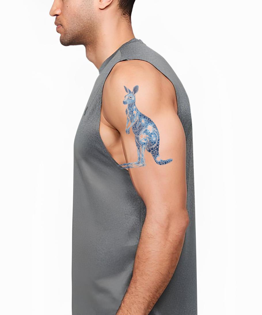 体验这款几何袋鼠纹身设计,象征性地融合了澳大利亚的自豪感与美学内涵。鲜艳的蓝色调,令人联想到国旗,在马赛克图案中舞动,星星轻轻闪烁其中。这不仅仅是纹身墨水,更是对澳洲大地的艺术致敬。
