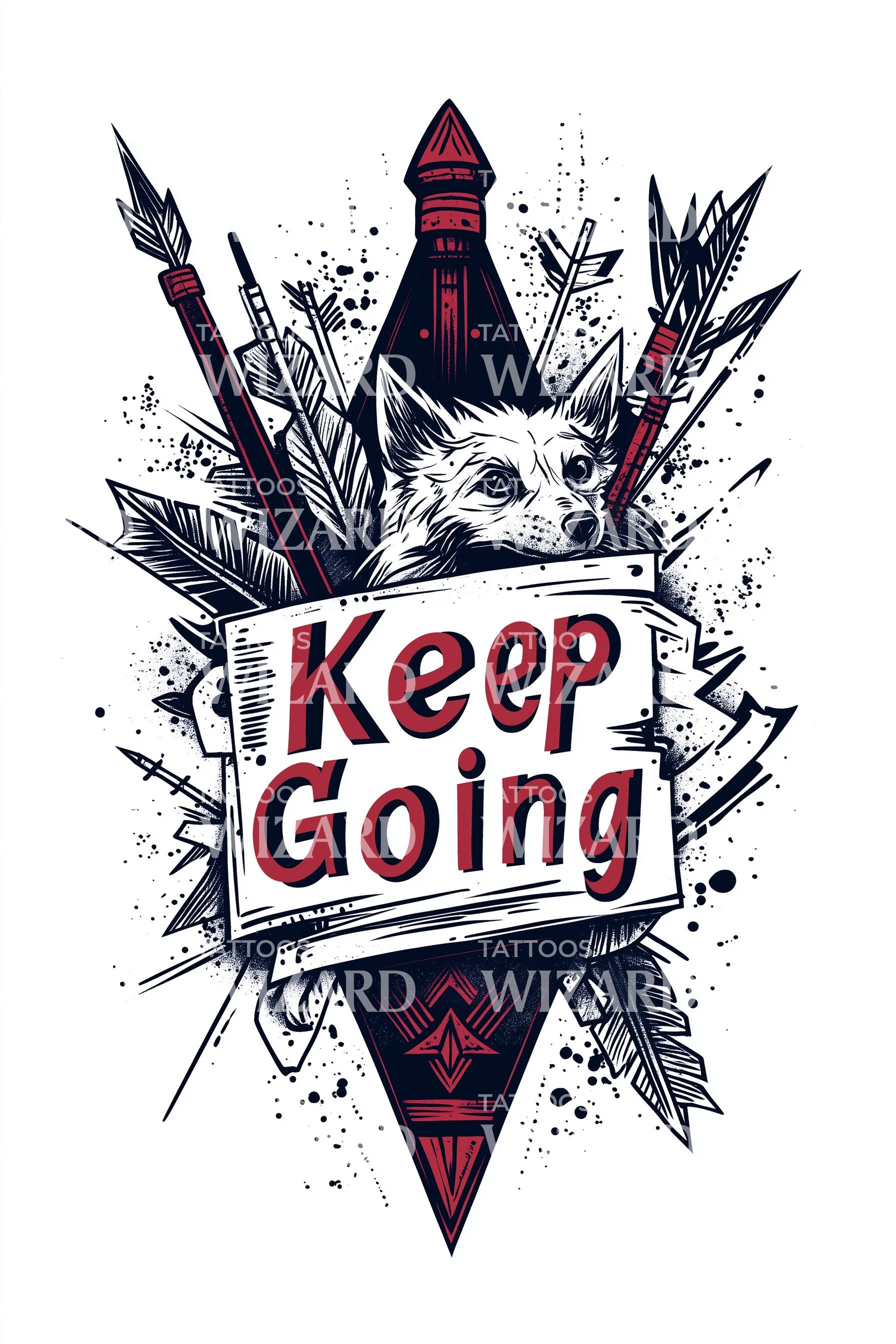 Newschool flash erupts in red energy: a bold spearhead emblem, arrows and splatter framing a sharp-eyed fox above a weathered banner reading Keep Going. Symbolizing relentless focus and survival instinct, this piece channels grit and momentum, making the wearer feel alert, armored, and unstoppable. Fierce, forward, ever onward, rising.