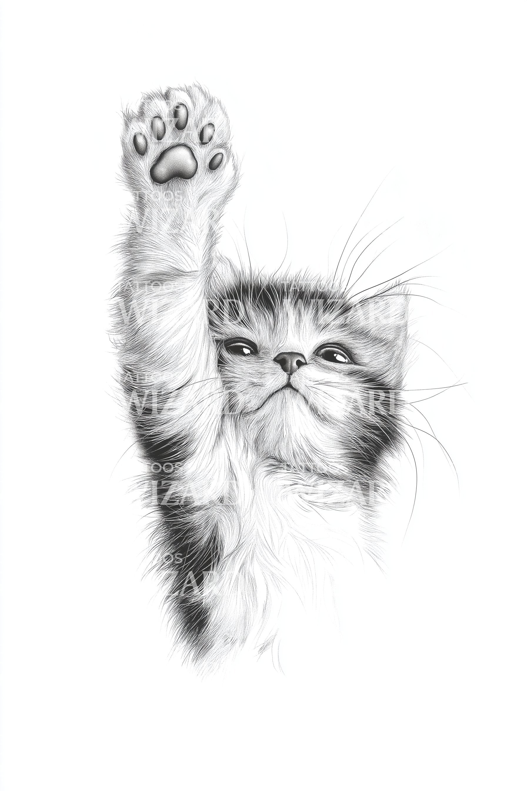 Fineline whiskers and feathered shading frame a playful kitten stretching skyward, one paw lifted, pads soft and bright. The reach speaks of curiosity, small courage, and the love of a cherished pet. Worn daily, it feels like a gentle nudge to keep exploring with heart-first, kitten-cute hope.