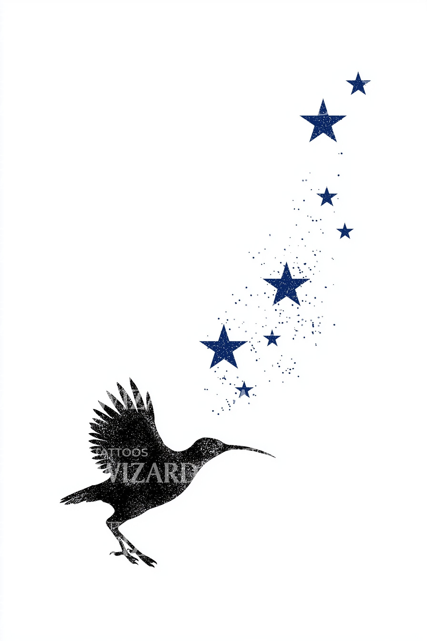 体验新西兰的遗产,这款精细的纹身设计以该国标志性的奇异鸟为核心,星星形成迷人的轨迹,呼应国旗上的天体象征。丰富的蓝色调捕捉了壮丽的夜空,融合了优雅与爱国魅力。