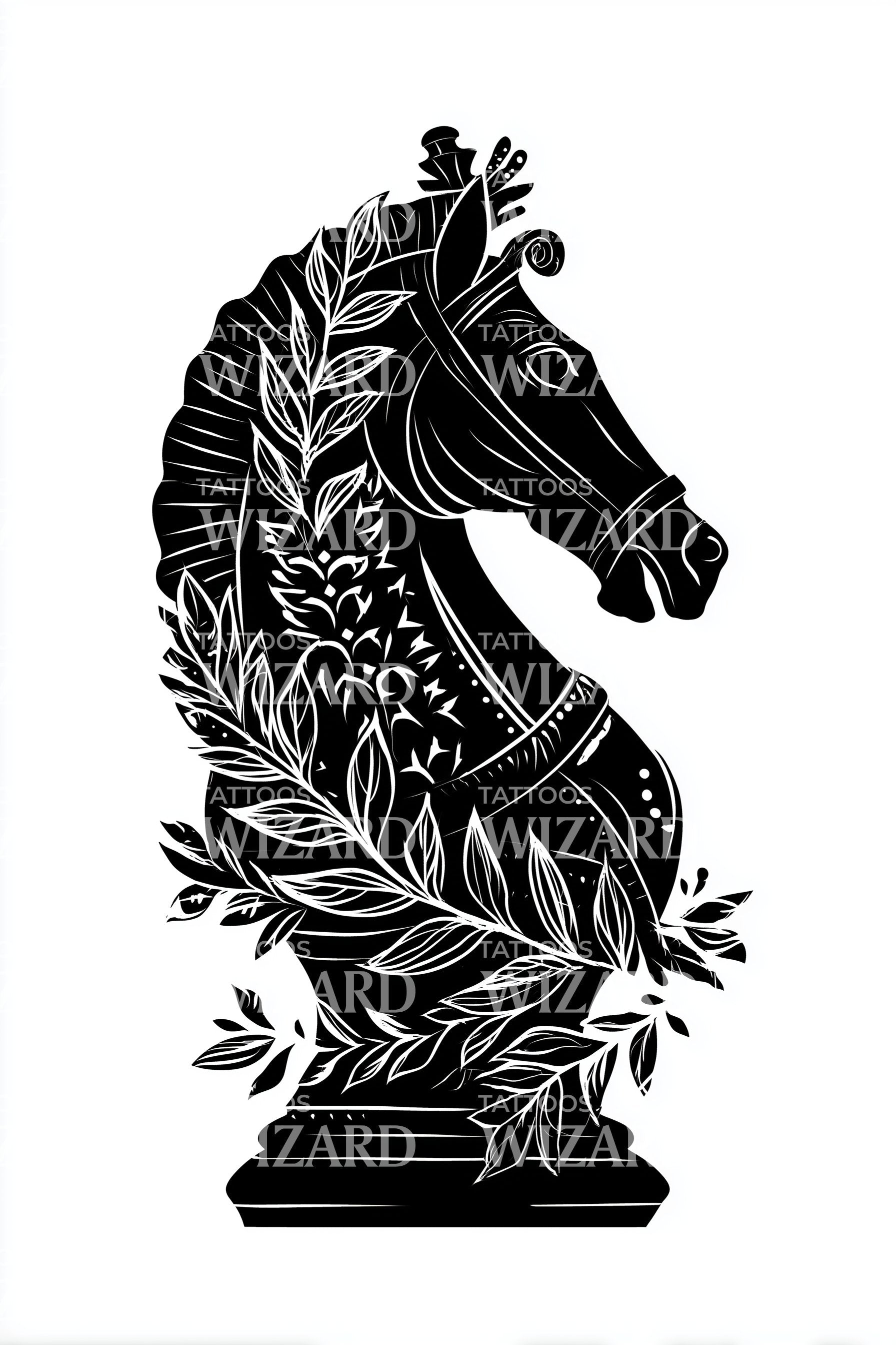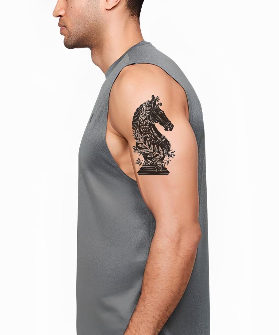 沉浸于骑士精神与英勇世界,这款黑灰纹身设计展现了一位骑马骑士的强大剪影,精致的月桂花环细节环绕其间,象征力量与荣耀。非常适合热爱骑士时代与传奇探险的你。