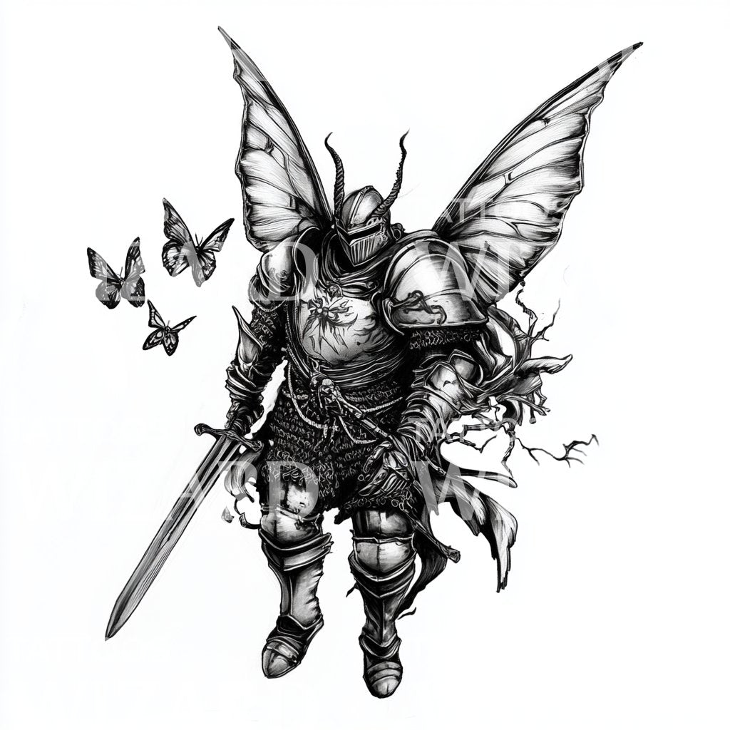沉浸在骑士精神的世界中,这款黑灰色的纹身设计展现了一位强大的骑士,象征着力量与和平的统一。强大的剑与精致的蝴蝶之间的对比增添了复杂性,而细致的盔甲则增强了其威严的形象。对于战士灵魂来说,这是一件真正的杰作。