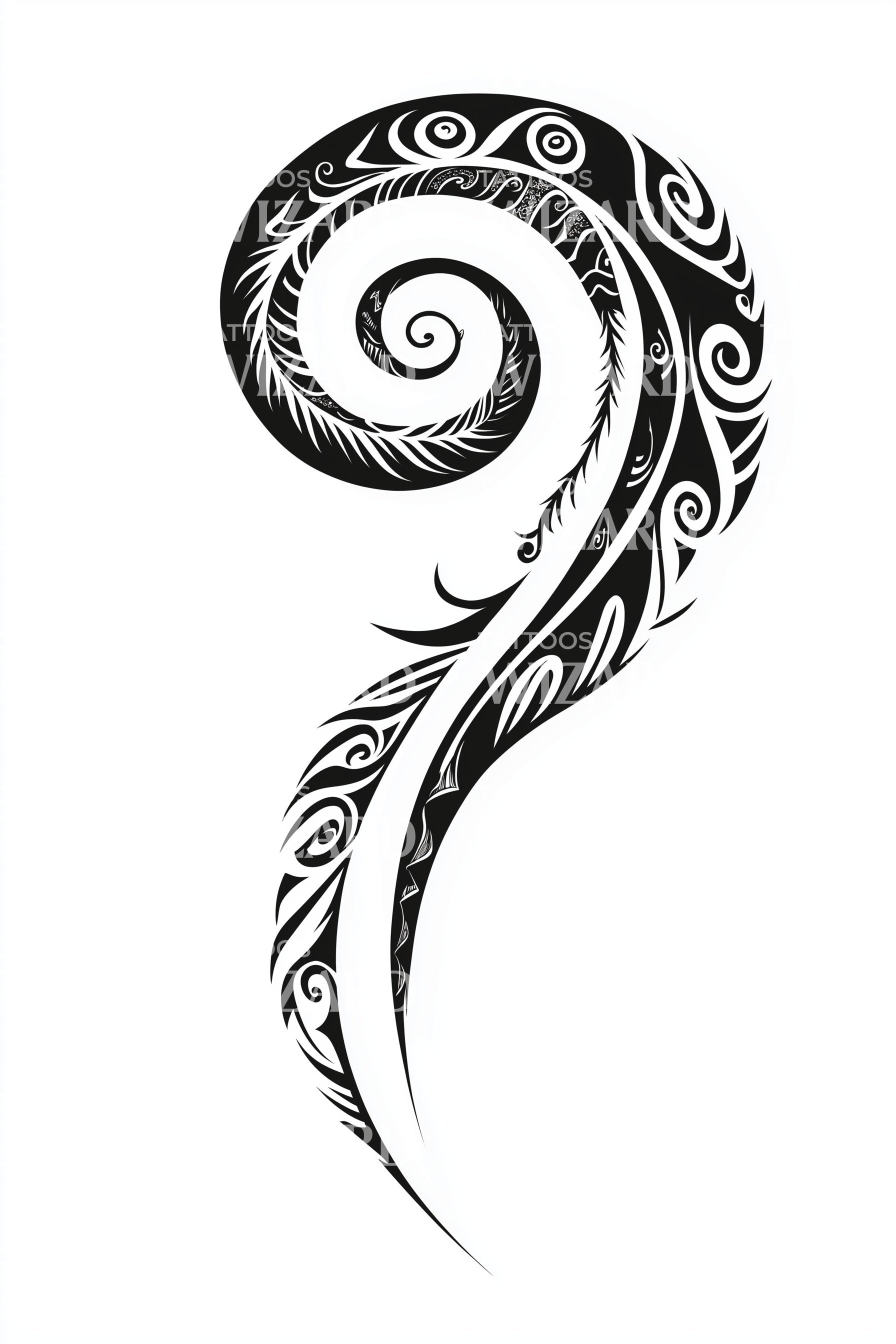 Bold Maori koru spirals shape a black flowing crest, feathered with tribal motifs. Koru recalls unfurling fern, growth, renewal, and life’s flow; the spiral holds momentum and protection. Wearing it feels grounded yet rising. Placements: forearm echoing curve, shoulder-bicep wrap, ribcage quiet flow, outer calf vertical lift.