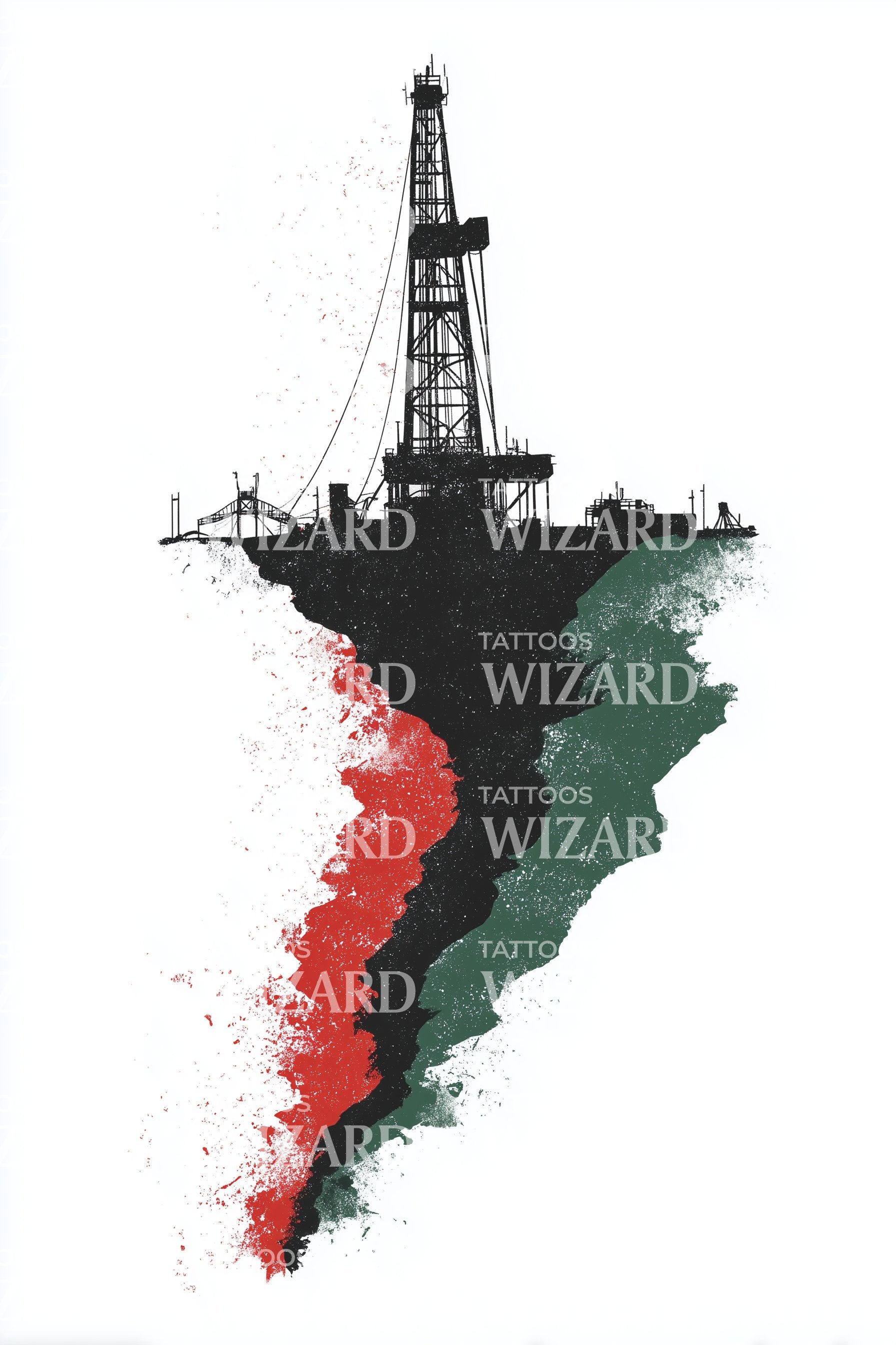 这款素描纹身设计向科威特致敬,展现了一个复杂的石油钻机图案。以该国国旗的鲜艳色彩——红色和绿色点缀,这件细致的作品艺术性地融合了爱国情怀与工业元素,创新独特。非常适合珍视科威特丰富石油遗产的人士。
