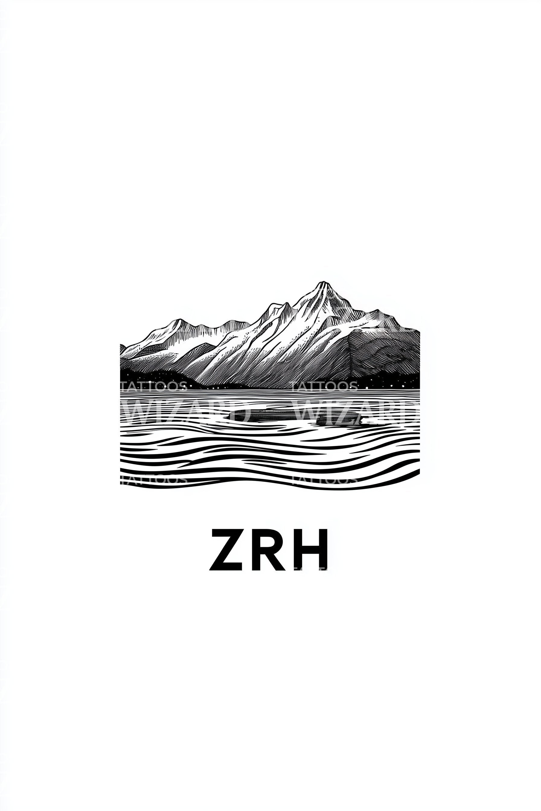 A crisp, illustrative vignette of Zurich: alpine peaks etched in fine lines mirror across tranquil lake ripples, anchored by ZRH. Mountains embody resilience and ascent; water speaks to clarity and flow. Switzerland distilled to minimal harmony, it carries calm confidence and the quiet thrill of return and departure.