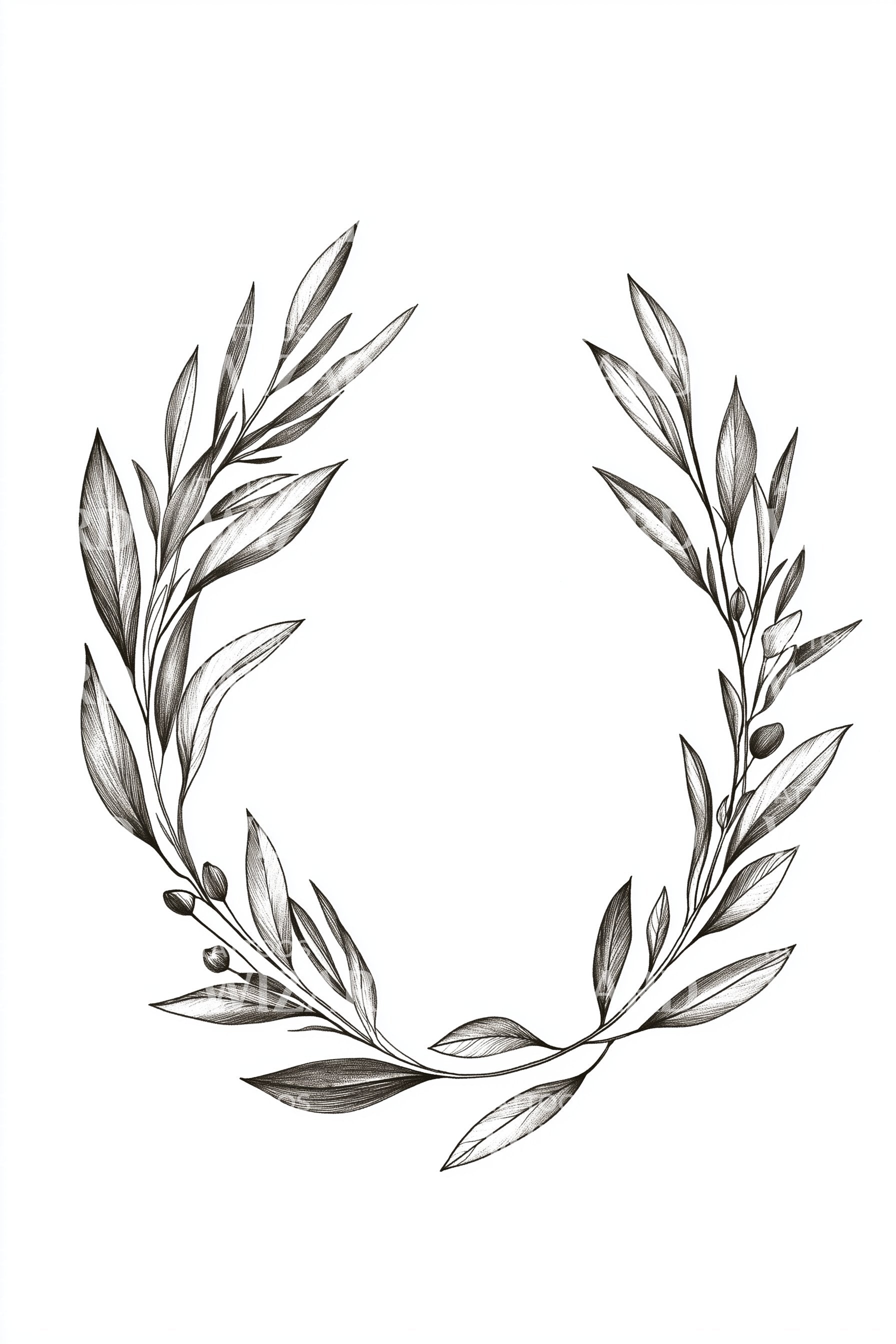 Delicate fine-line leaves arc into an open botanical circle, a graceful garland with soft shading and tiny olives. Symbolizing peace, growth, and resilient renewal, the wreath honors nature’s steady rhythm. Worn on skin, it feels like a quiet halo of grace, grounding the heart with elegant, enduring calm.