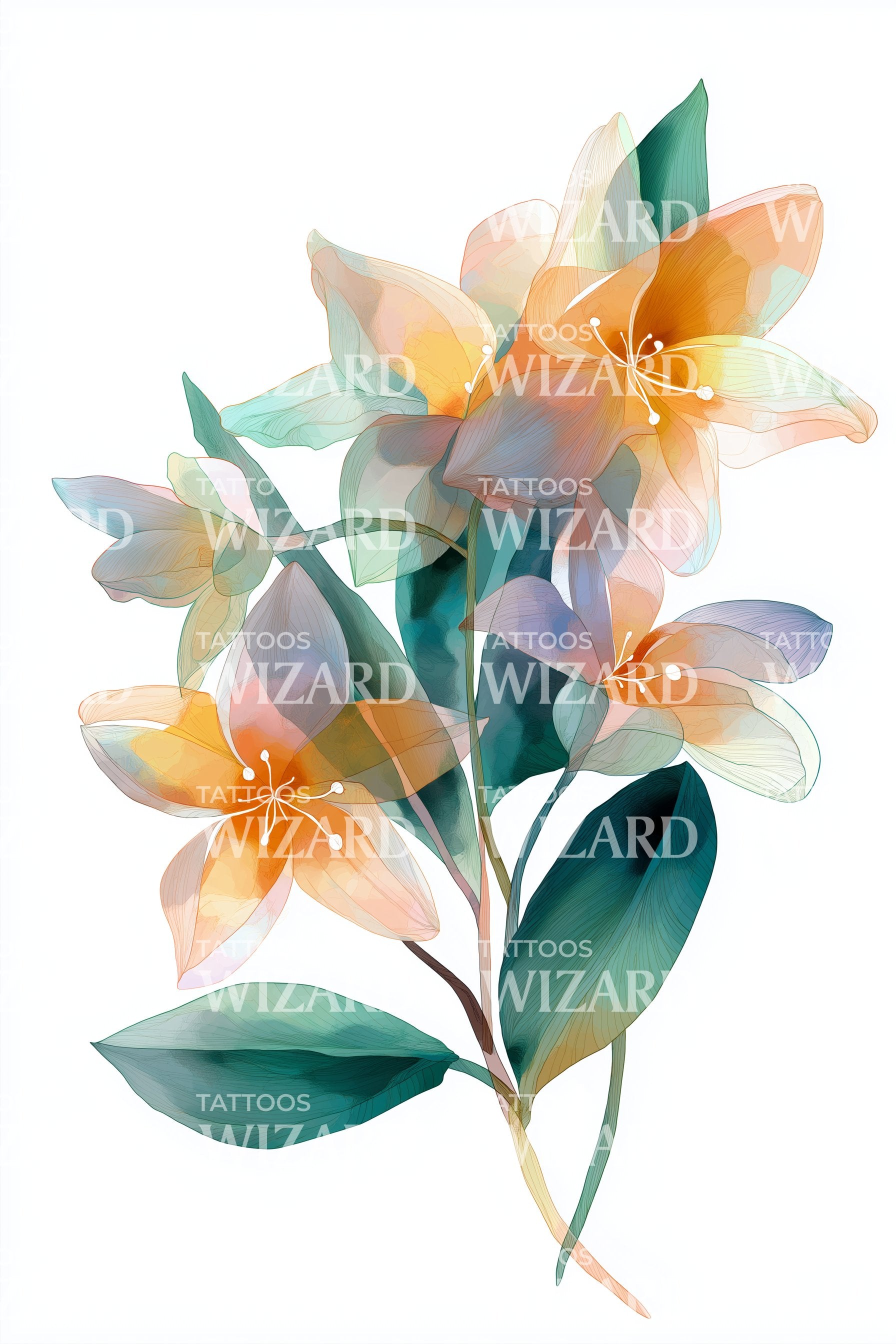 沉浸于充满生机色彩的世界,这款惊艳的水彩纹身设计。采用半透明的叶子和花卉元素,作品展现出一抹美丽的橙色与青绿色调。优雅与前卫艺术的融合,正是你下一次身体装饰所需的一切。