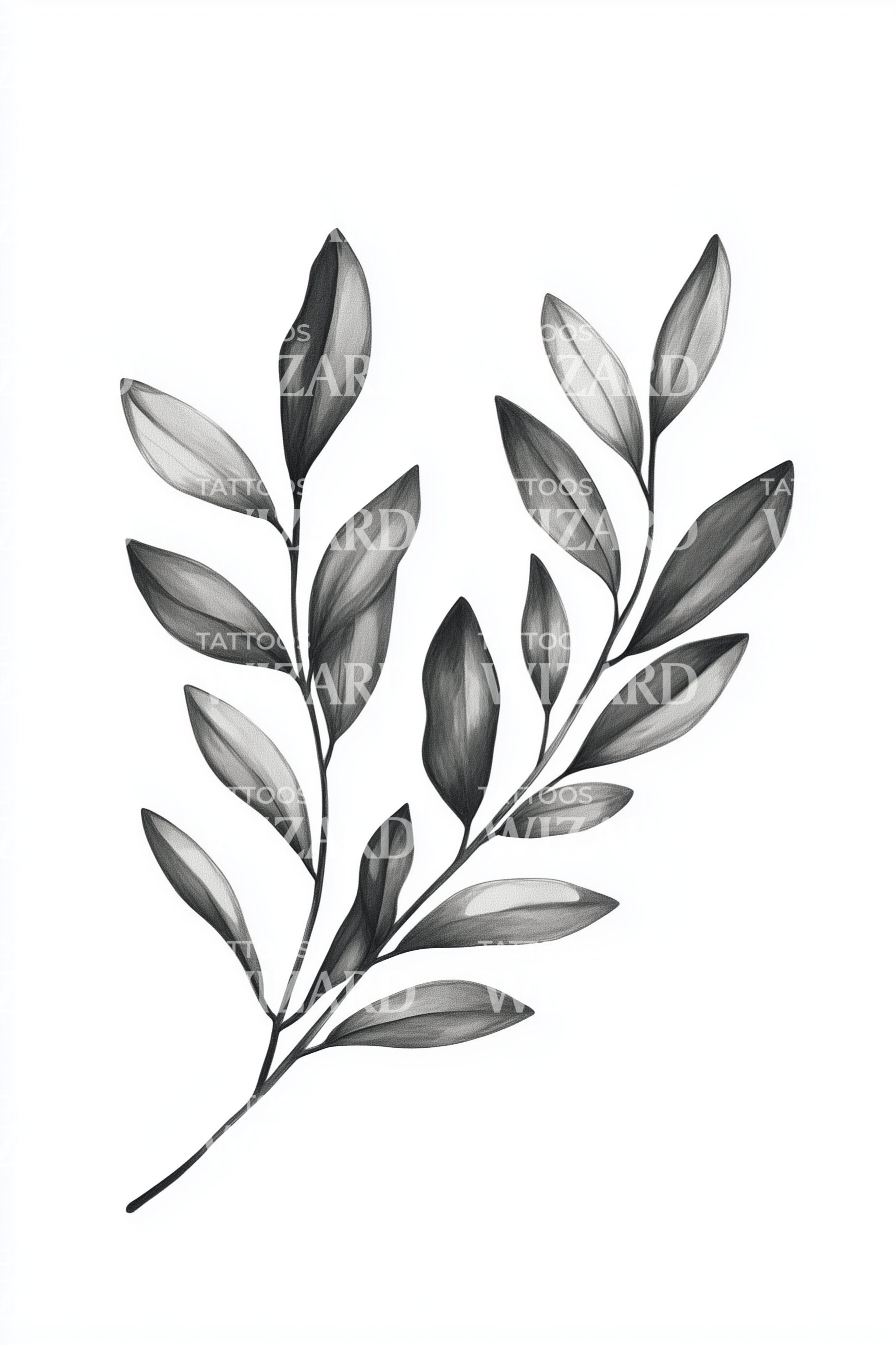 A slender botanical branch in blackwork, each leaf softly shaded along a fine stem, creating a minimal, graceful silhouette. Symbolizing steady growth and renewal, it celebrates quiet strength and connection to nature. Worn close, it invites calm, clarity, and grounded elegance through every season of becoming.
