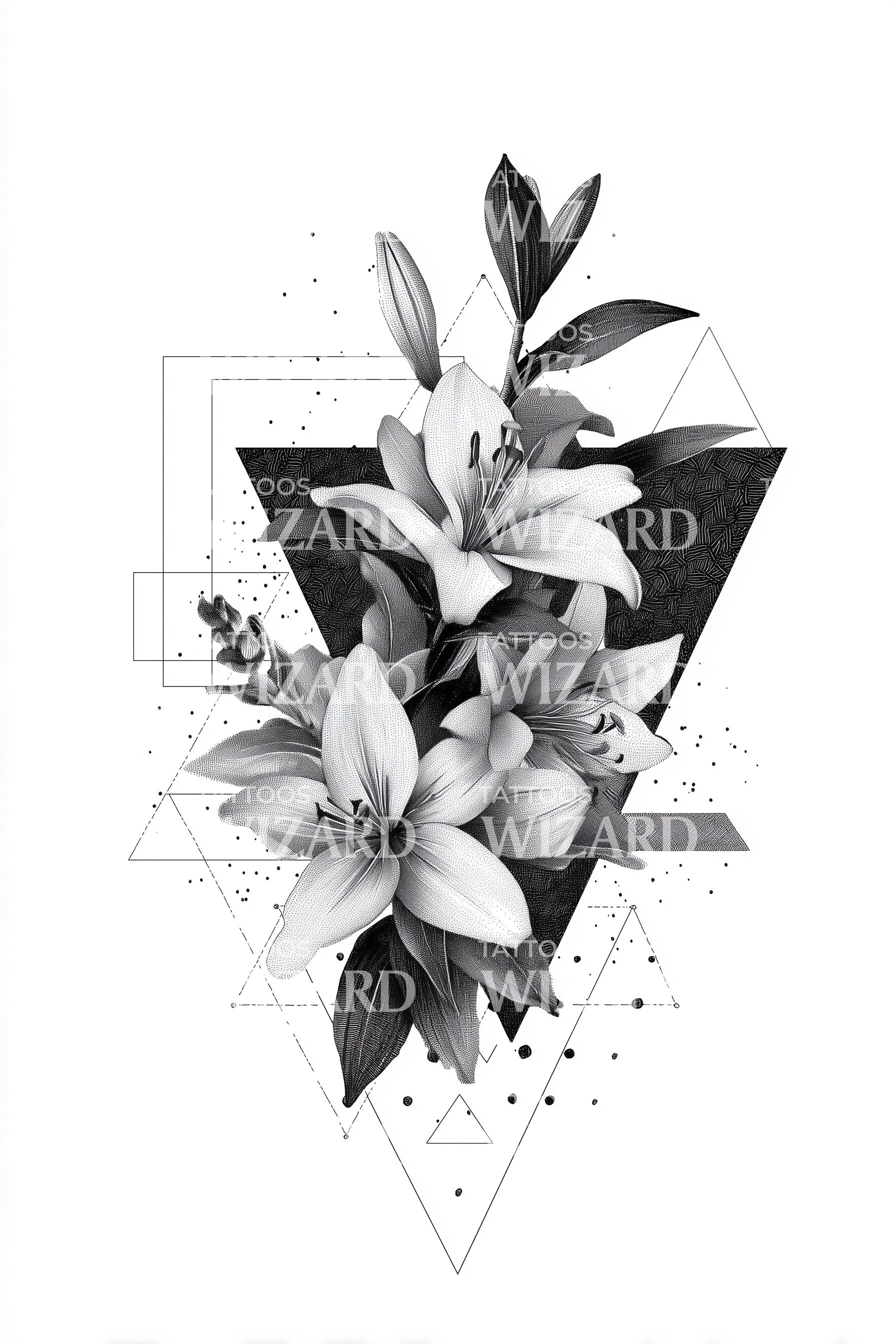 踏上自我表达的旅程,体验这款抽象几何百合纹身设计。以黑色三角碎片的鲜明对比,这件艺术作品轻松融合了几何与自然。设计散发出现代象征主义,通过独特的视角展现百合的神圣之美。