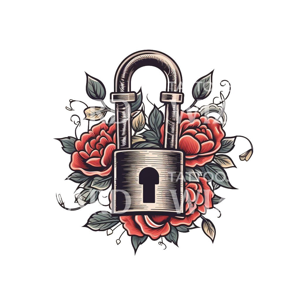 通过我们的老式锁和钥匙纹身设计,解锁一个永恒魅力的时代。被复杂的玫瑰和郁郁葱葱的植物环绕,这个设计融入了经典的美学。它是对传统纹身艺术的致敬,非常适合寻求复古魅力的爱好者。