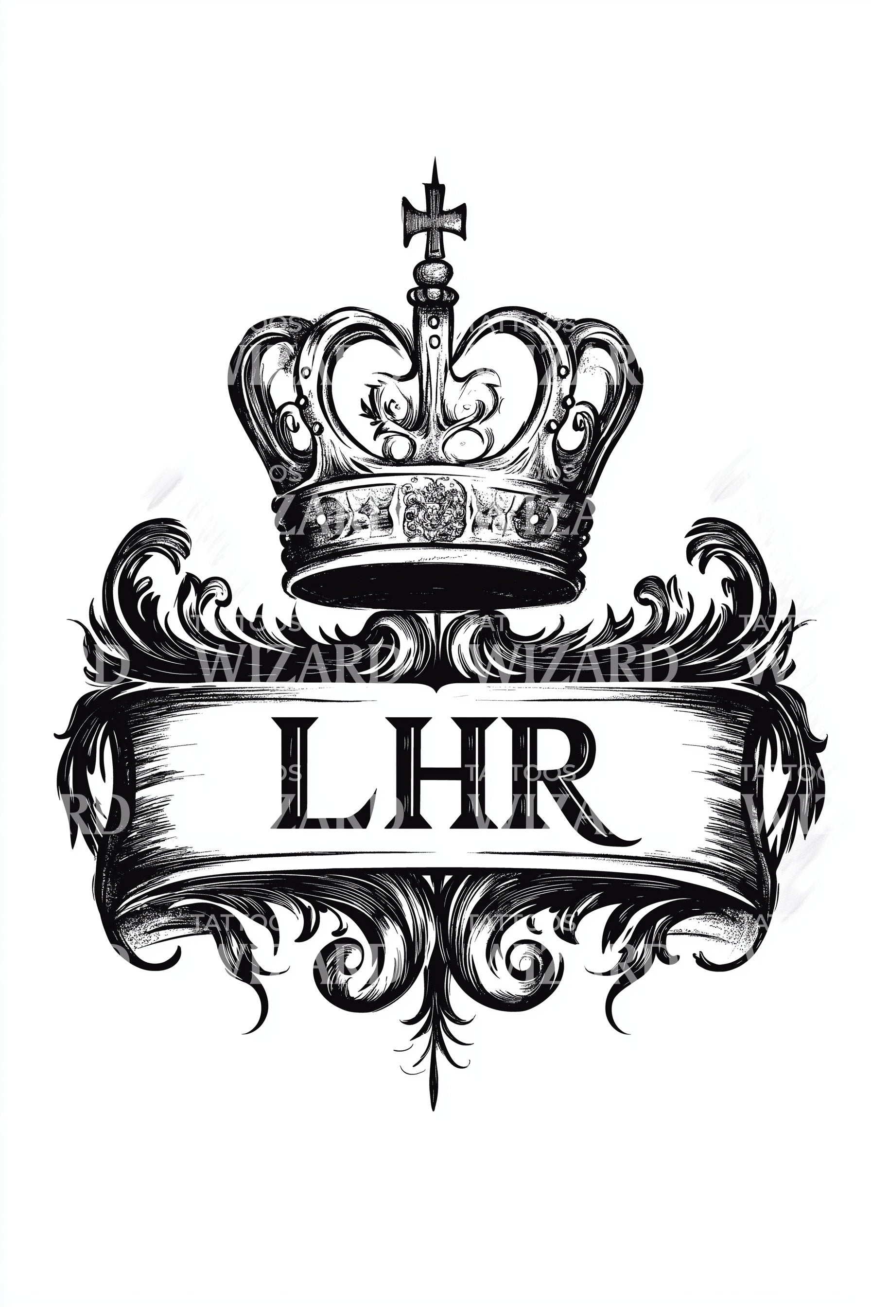 Ornate Victorian scrollwork cradles a bold LHR beneath a regal crown, forming a vintage London crest. Flourished lines echo wrought iron gates and heraldic banners. Symbol of arrival, belonging, and legacy, it honors royal strength and city grit. Worn, it feels stately, grounded, and timelessly brave.