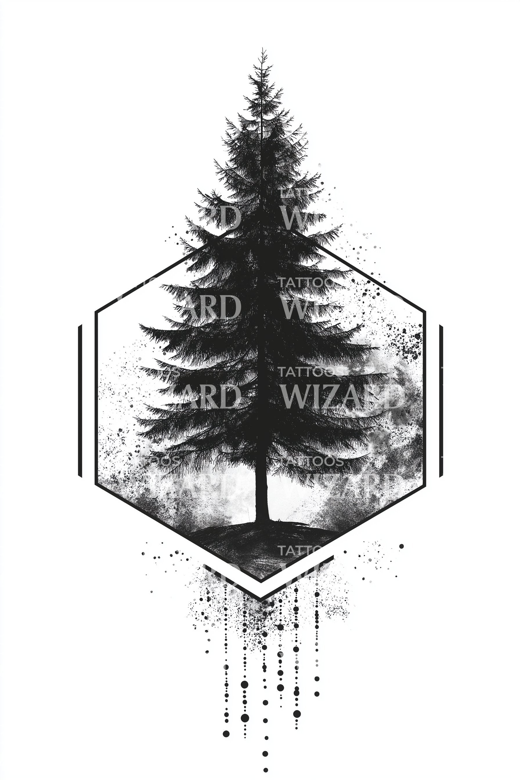 拥抱宁静,这款几何点描纹身设计以独特的六边形框架中矗立的孤松为主题,象征着坚韧与孤独。灵感源自自然元素,精致的设计巧妙融合了几何与有机形态,成就一件令人着迷的身体艺术作品。