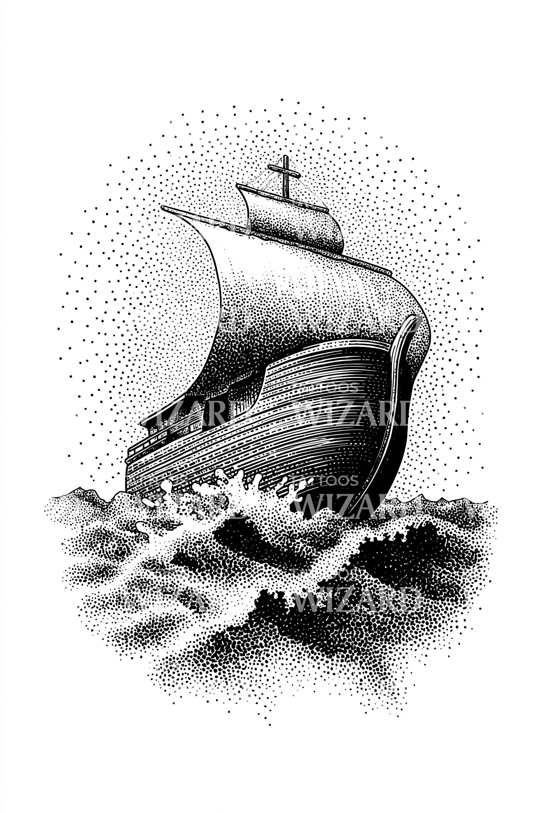 沉浸于维京遗产的宏伟之中,这款黑色纹身设计展现了一场海上冒险,细致描绘了一艘勇敢迎接即将来临风暴的长船。这件富有表现力的作品彰显了维京人的勇气、精神与传承。