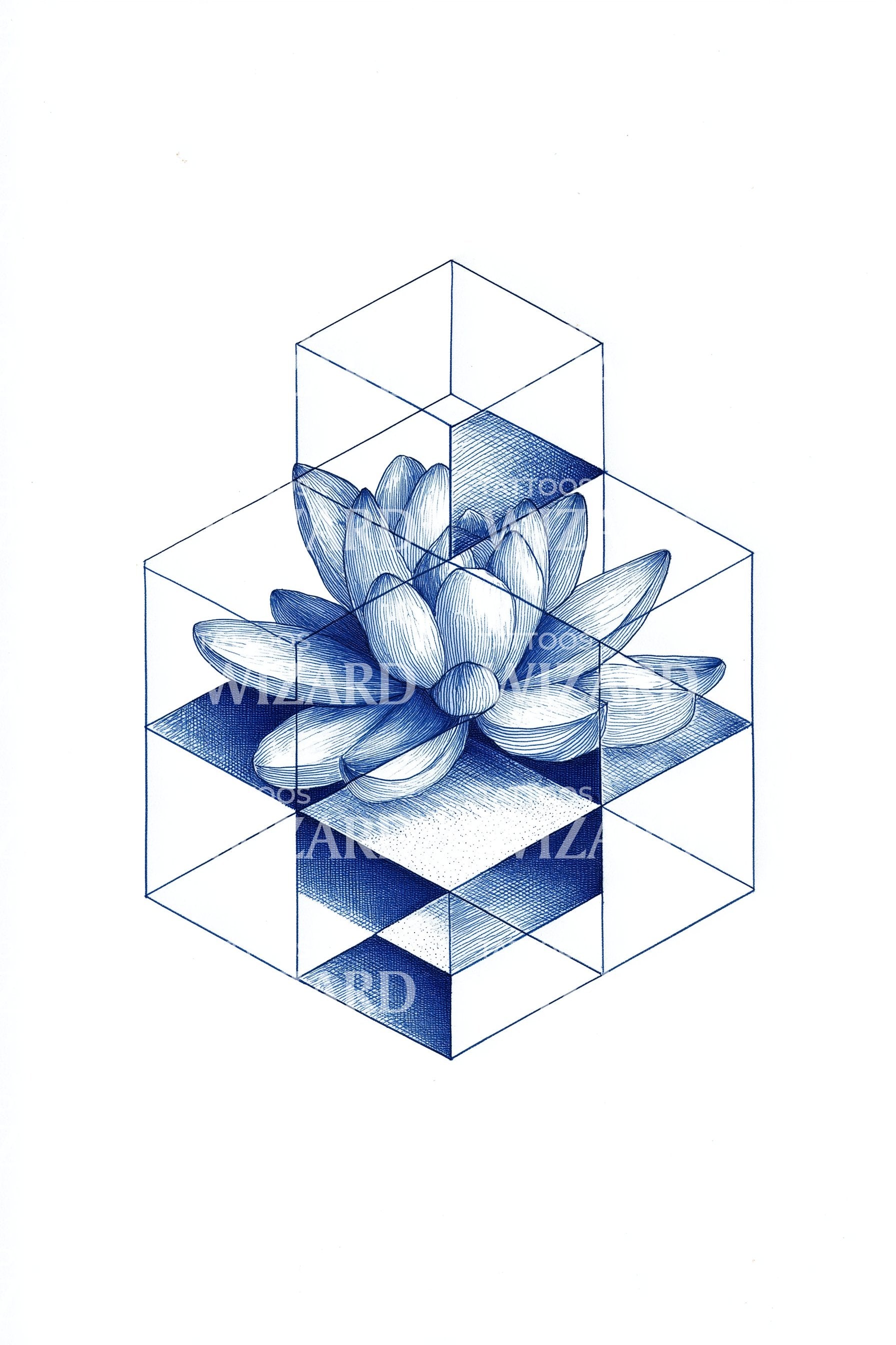 沉浸于宁静之中,这款美丽的水彩纹身设计。几何立方体与宁静的蓝色莲花巧妙融合,成为视觉焦点,散发出平和的能量。鲜艳的水彩效果突显了复杂的几何图案,使这款设计成为平和灵魂的惊艳杰作。