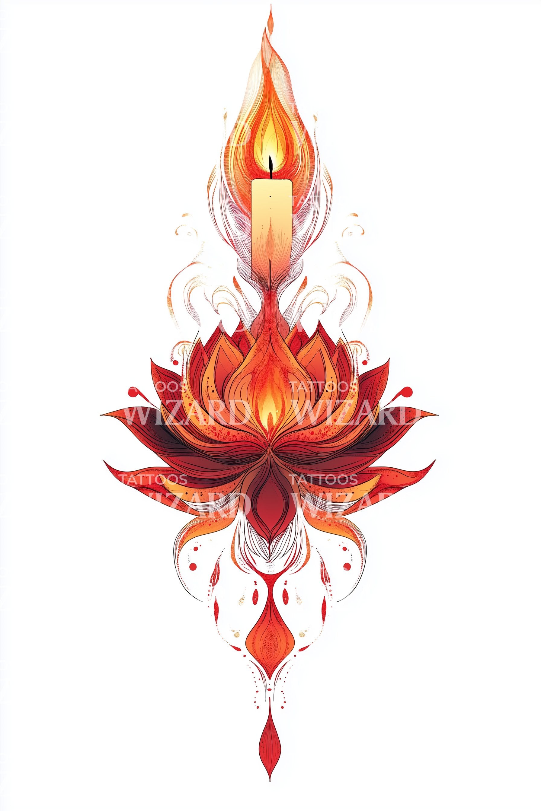 沉浸于宁静之中,这款水彩纹身设计展现了宁静的莲花与蜡烛的对比,完美诠释了冥想与光明。火焰以鲜艳的红色呈现,增添了生动的对比,为作品注入生命力。此设计是对宁静与内心平和的深刻提醒。