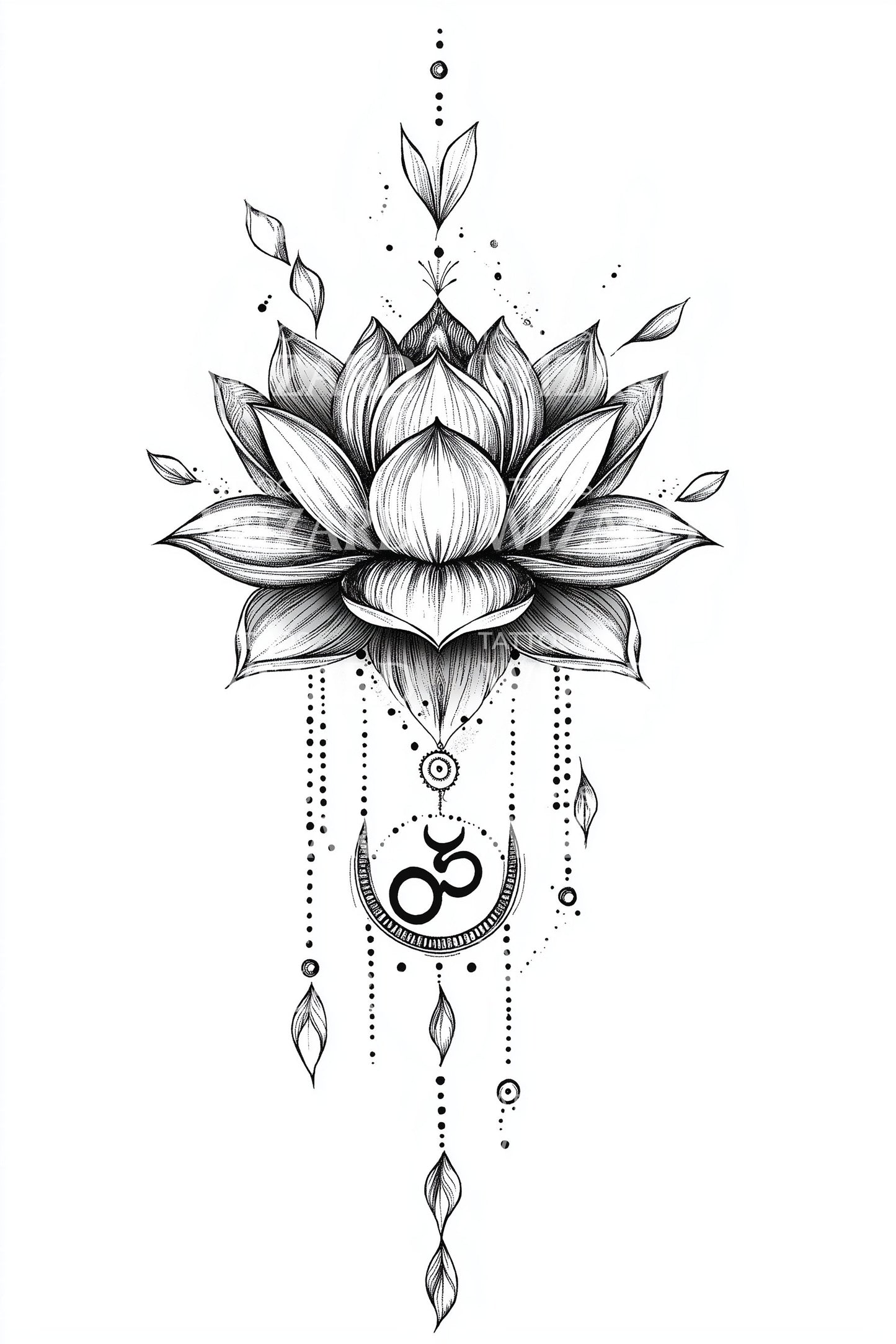 这款优雅的纹身设计以装饰性的吊坠为特色,精心雕刻着富有灵性的图案。其主要亮点是一朵精致设计的莲花,象征纯洁与觉悟,优雅地悬挂,完美呈现这件杰作。以这款独特的纹身设计,拥抱灵性优雅的气息。