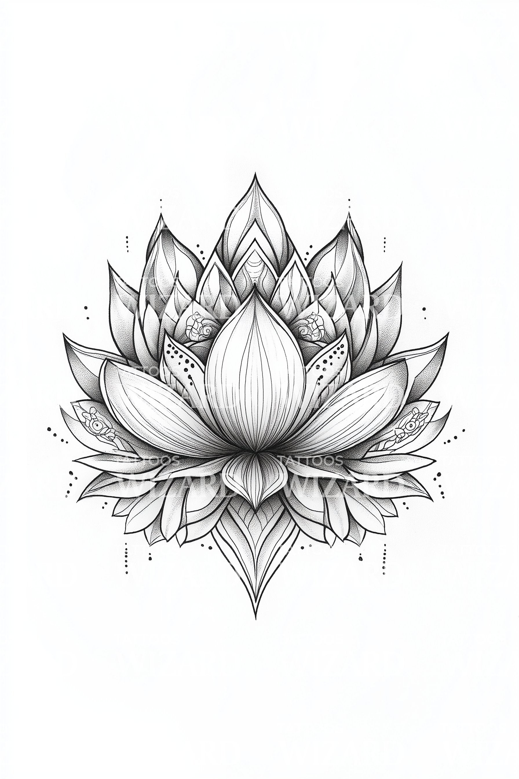 Ornate lotus crowned by layered petals unfolds in crisp black line and gentle dot shading, a floral diadem of elegance. Symbolizing rebirth, serenity, and self-sovereignty, each tier rises from stillness. Wearing it feels like quiet ascent, a regal calm resting over the heart, radiant poise and inner grace.