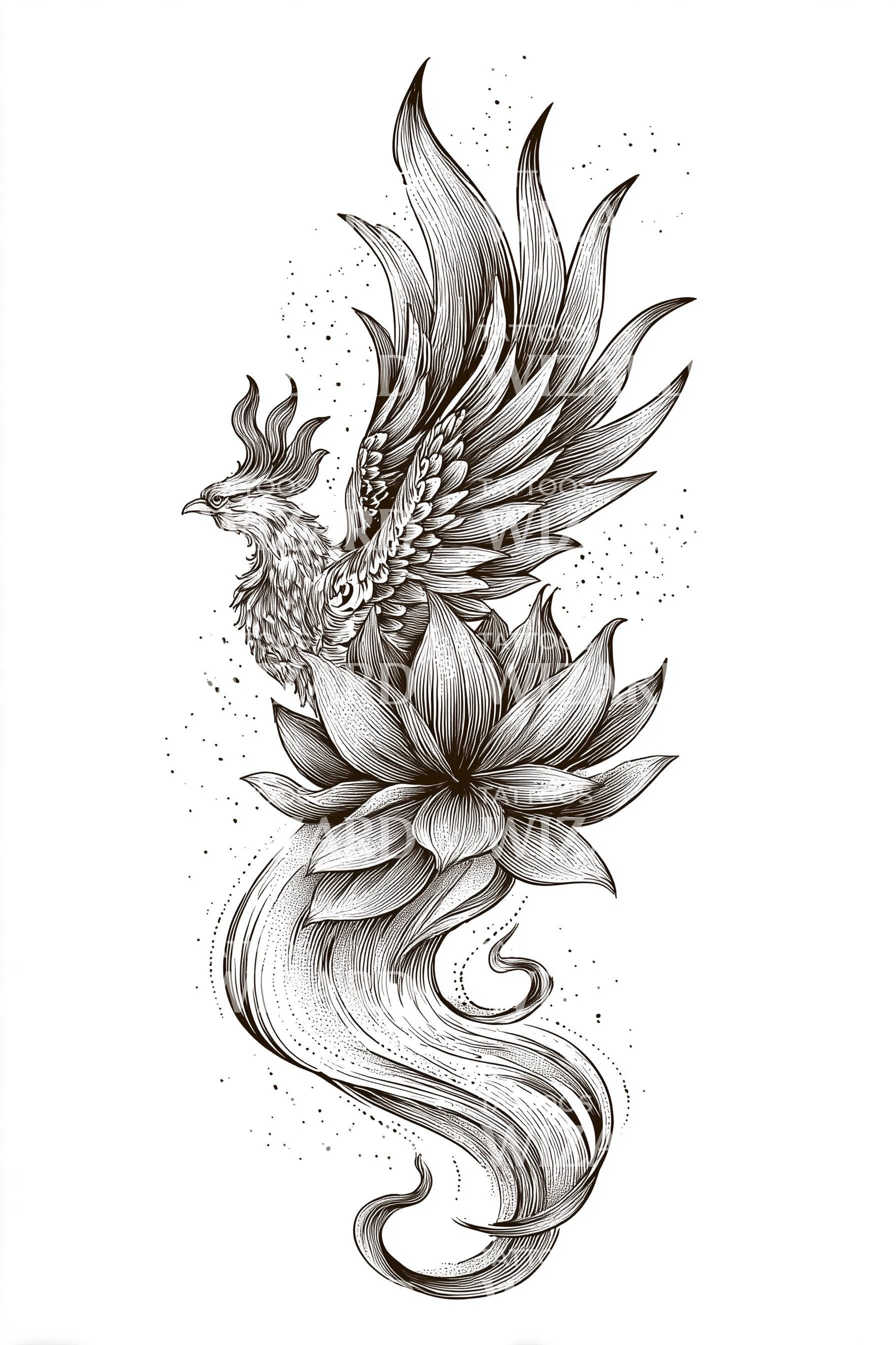 沉浸于东方神秘魅力的插画风格纹身设计中。它神奇地融合了令人敬畏的龙与宁静的莲花,以丰富的黑灰色调精美呈现。这是一件神话般的作品,完美展现力量与宁静。