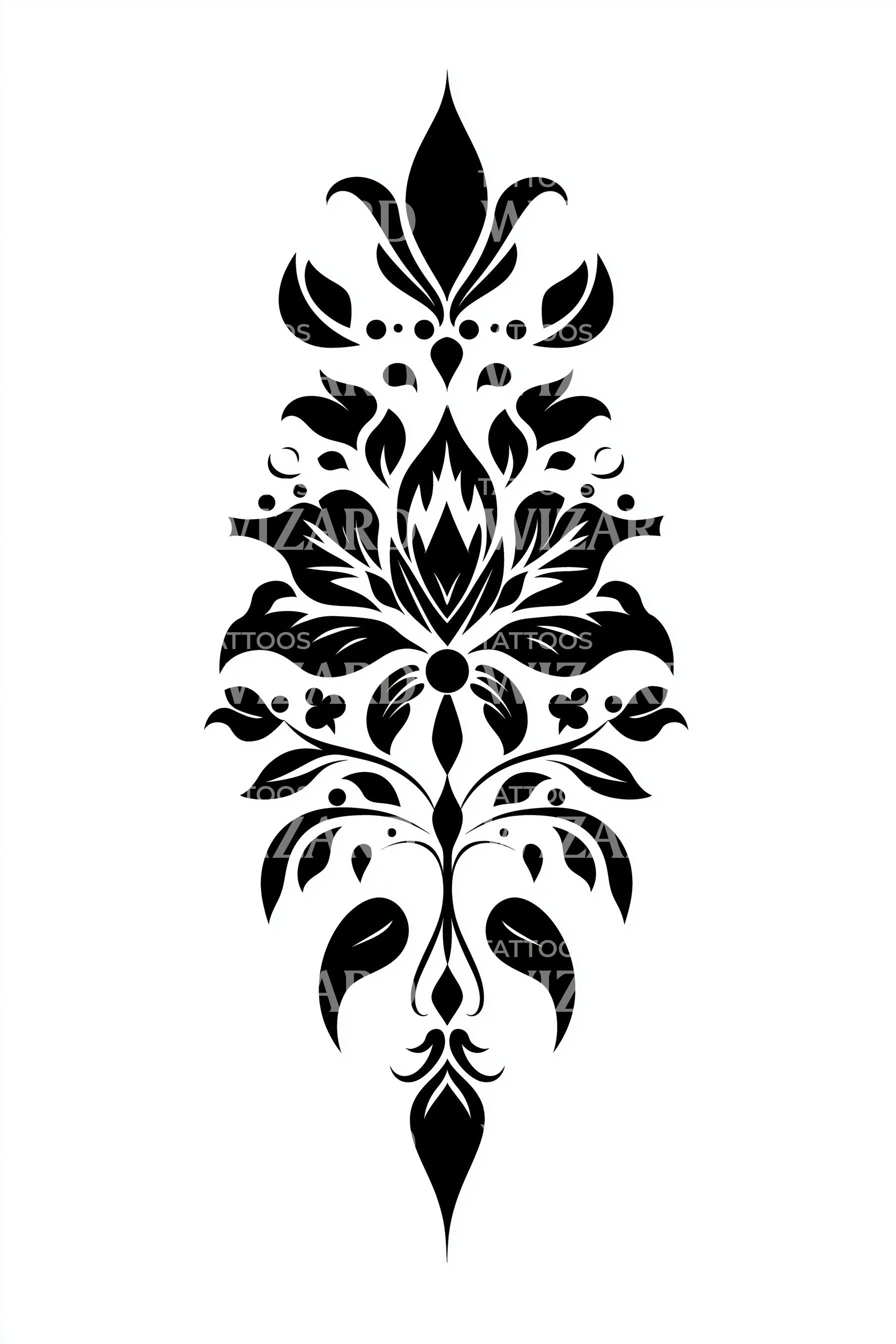沉浸于神秘主义,这款大胆的黑色纹身设计融合了盛开的莲花和装饰性火焰点缀,展现独特的灵性宣言。其花卉元素与温柔的神秘气息使其成为超越传统身体艺术的永恒之作。非常适合追求一丝魔力的你。