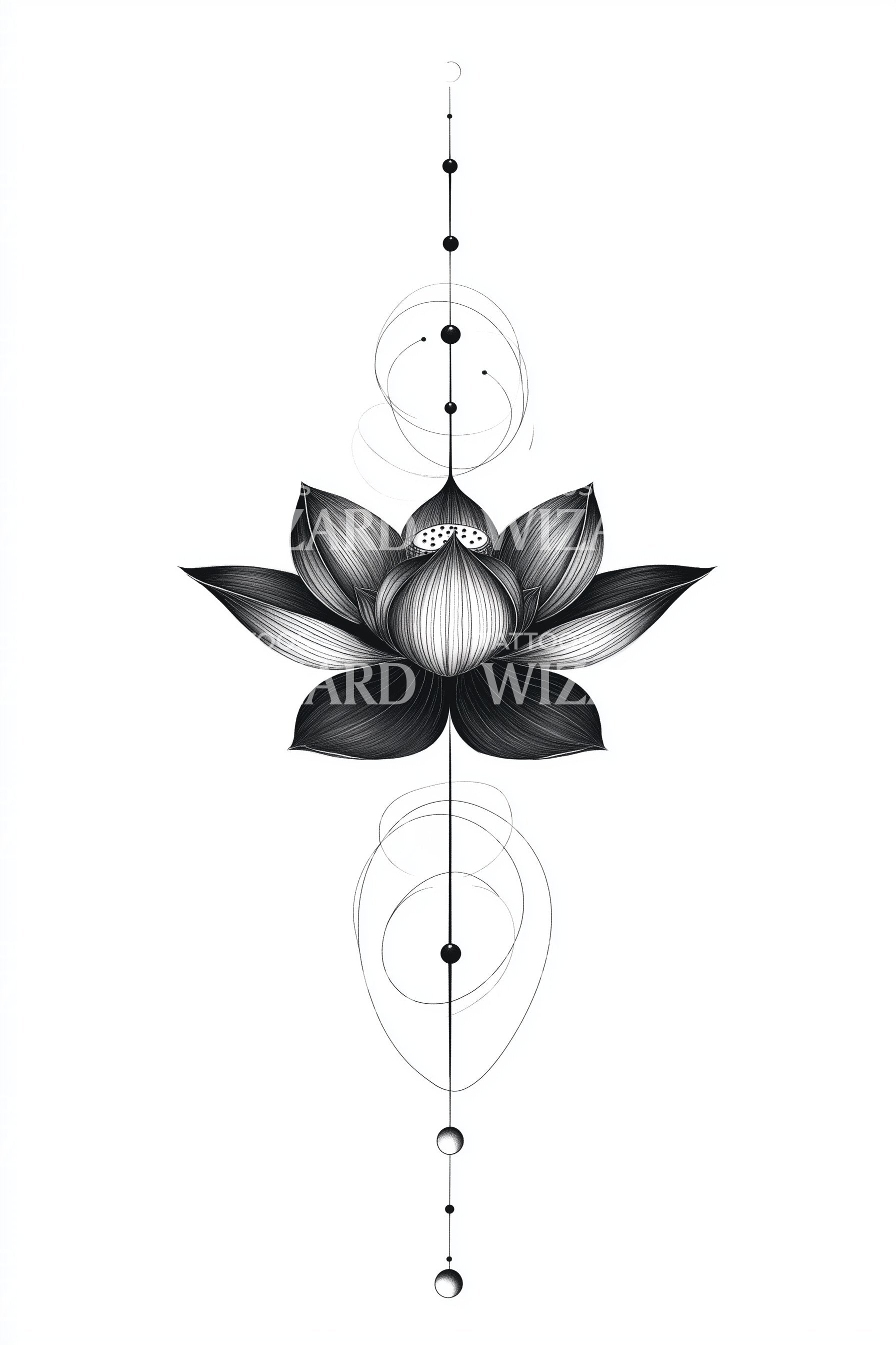 沉浸于我们几何莲花纹身设计带来的深邃宁静中,该设计精巧地融合了神圣几何学。它体现了脉轮的平衡,反映出和谐与生命的对称。莲花,作为神圣的象征,代表觉悟与重生。这是一件引人入胜的艺术作品,助您提升精神之旅。