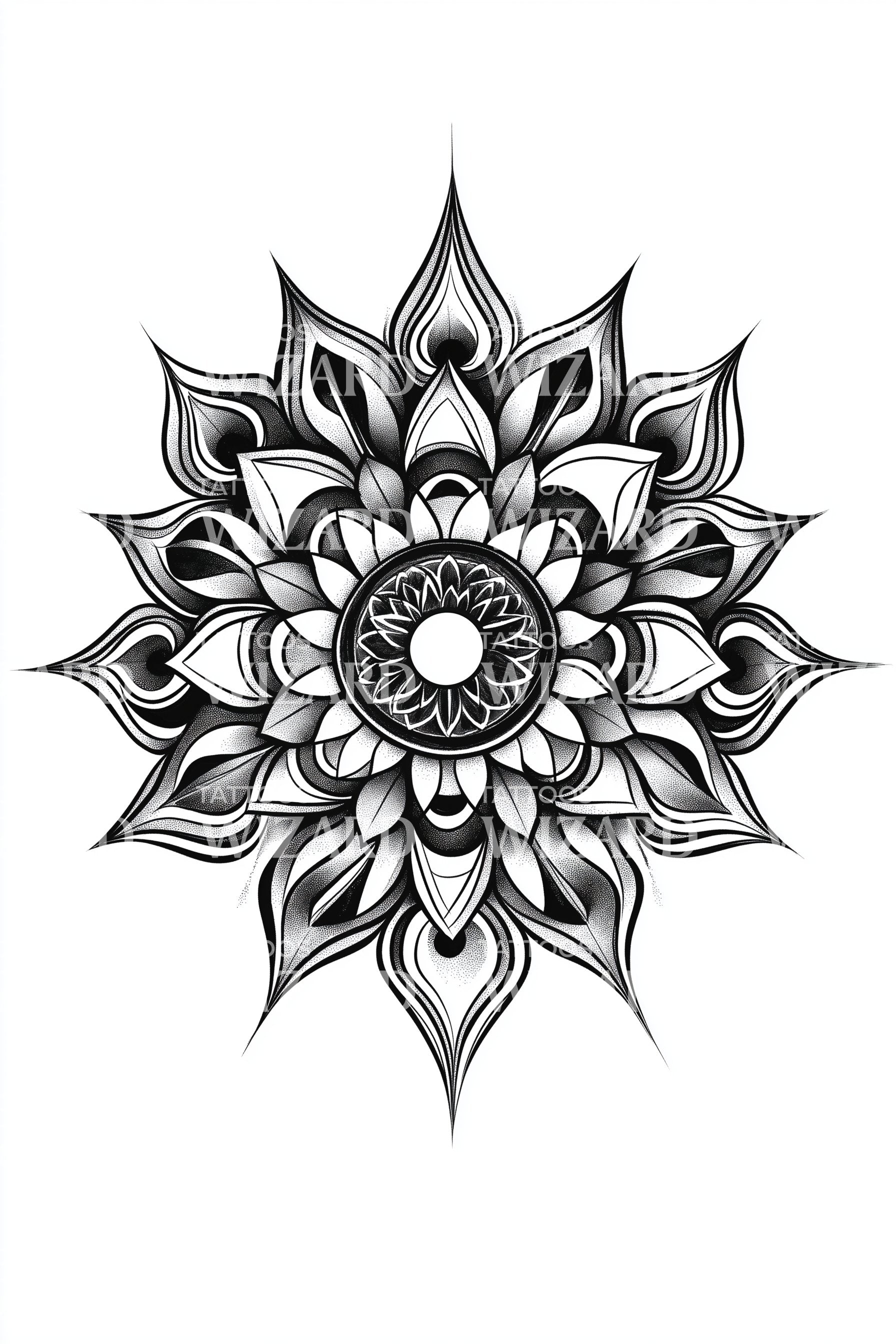 Radiant mandala lotus unfolds in layered petals, crisp black linework and soft stipple shading, forming a sacred, ornamental flower with a luminous center. Symbolizes rebirth, purity, devotion, and balanced calm. Wears like quiet armor. Ideal placements: sternum for symmetry, upper back for expansion, forearm for flow, thigh for anchoring.