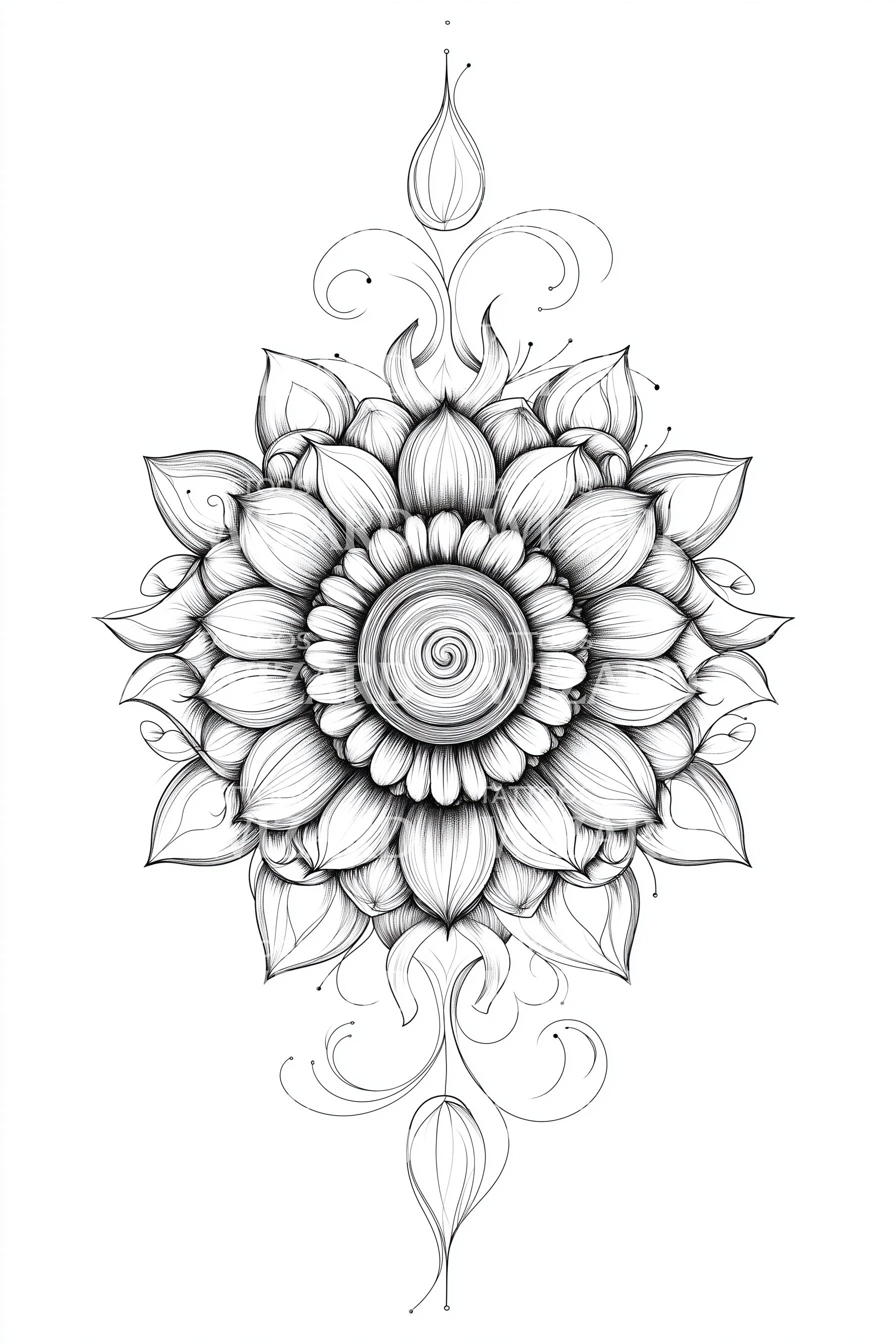 沉浸于这款曼陀罗纹身设计所展现的精神优雅。展现精致的莲花装饰、复杂的装饰细节和完美对称的图案。这一切都通过细腻的线条表达,呈现出美与宁静的和谐平衡,彰显您的个性与风格。
