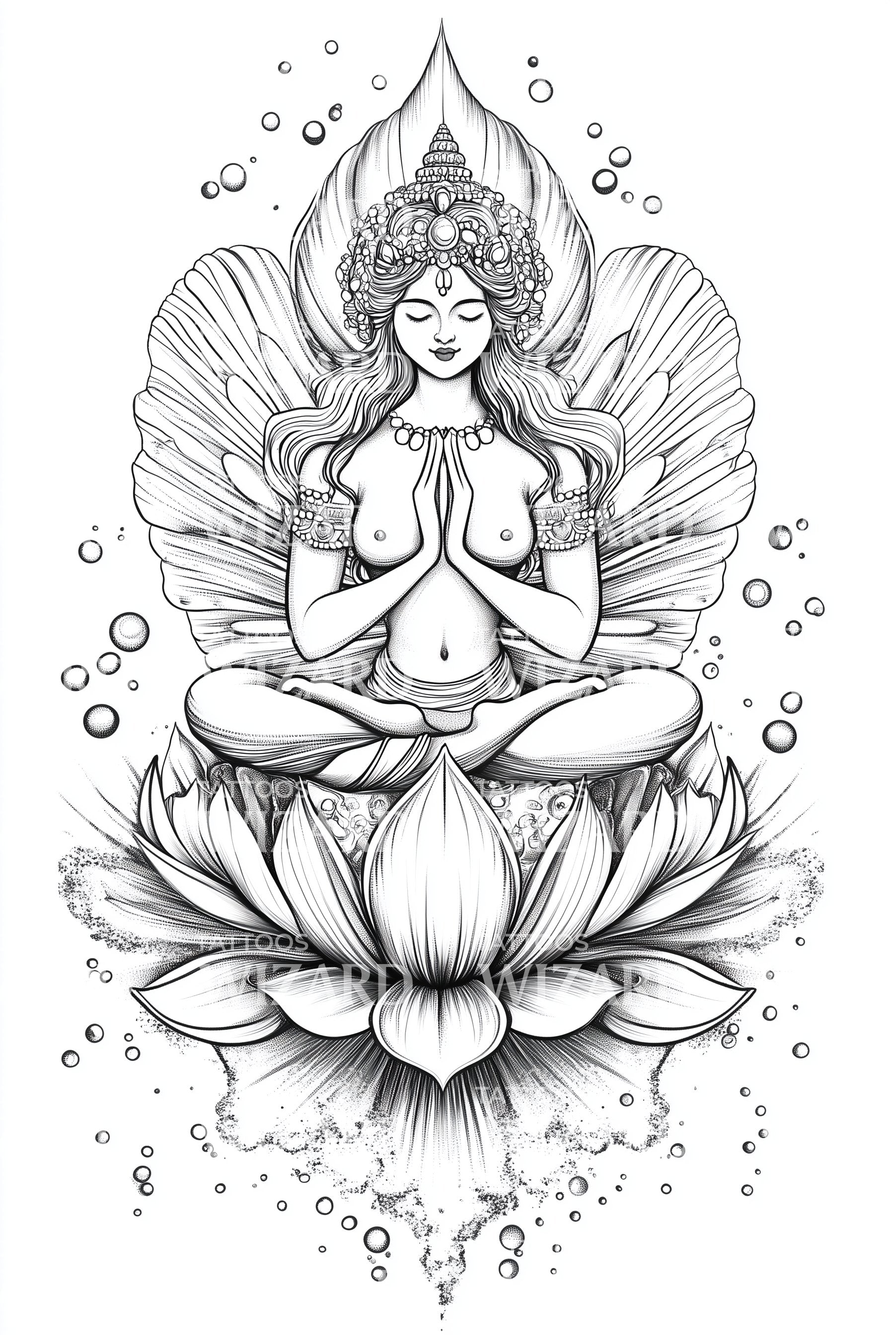 曼陀罗的宁静构成一位盘坐冥想的女神,宝石冠冕环绕光环,从层叠的莲花瓣和点状喷洒中升起。象征着觉醒、纯净与从静水中汲取的精神禅意。佩戴者感到内心平衡且静谧强大。理想位置:胸骨、脊柱、上背部、前臂,适合垂直对称设计。