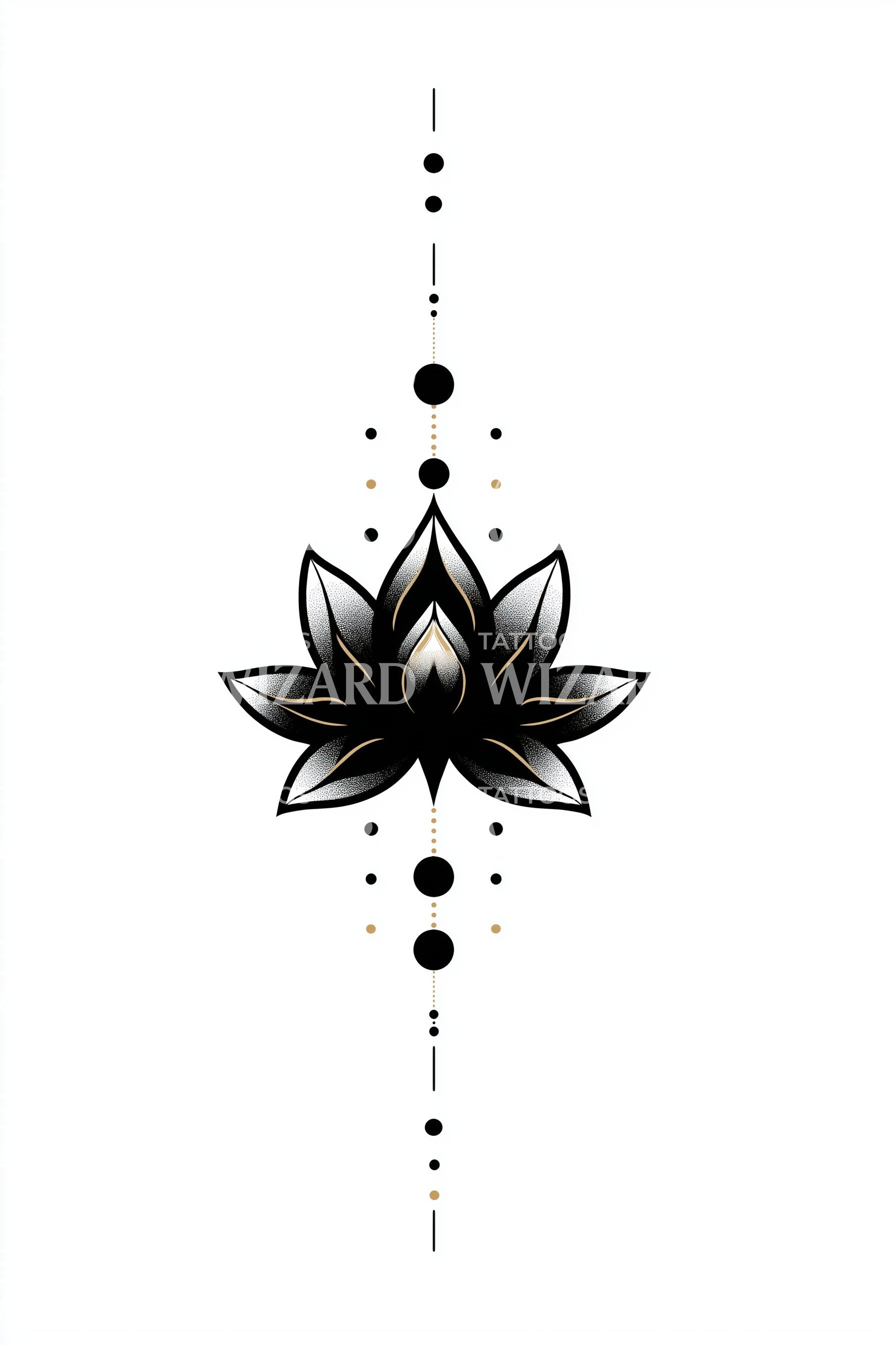 这款独特的黑灰纹身设计散发出由明暗对比所衍生的美学。设计的核心是一朵惊艳的莲花,周围环绕着精致的月相。神秘的黑色柱状图案为作品构建了框架,在黑色墨水的深处讲述着引人入胜的视觉故事。