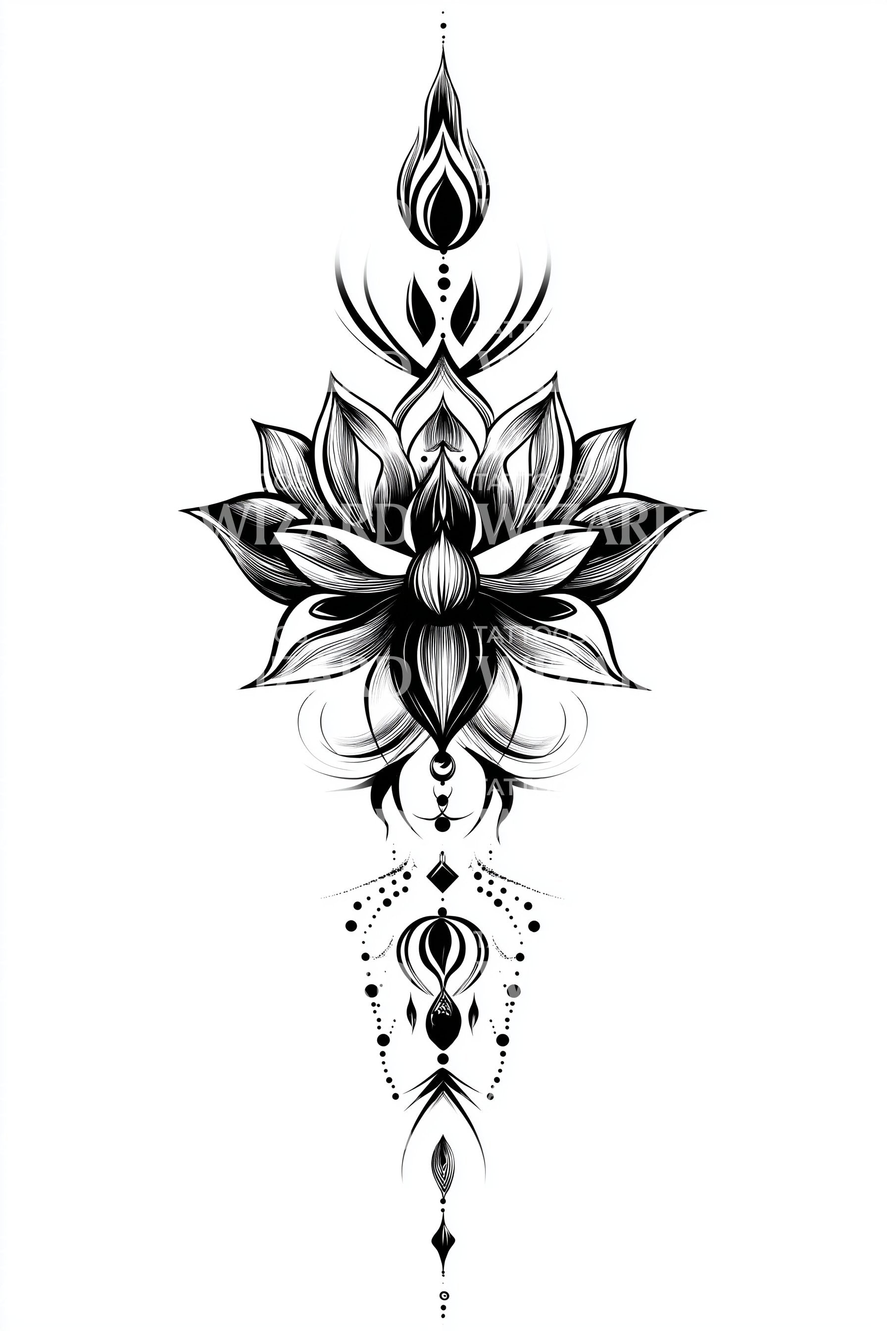 沉浸于这款装饰性纹身设计的美丽与神秘之中。以神圣的莲花巧妙地镶嵌在复杂的吊坠式垂饰中,这款纹身散发出空灵的魅力。作为花卉优雅的精致融合,它和谐地平衡了细腻与大胆。