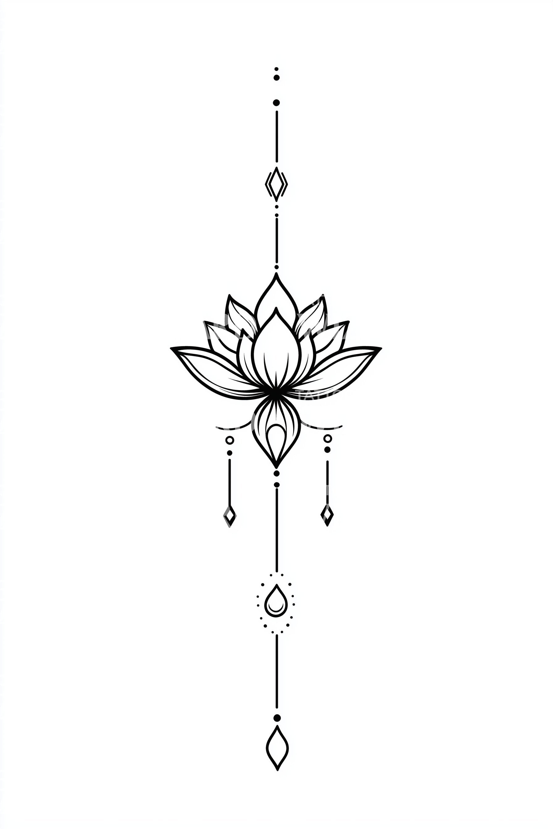 通过这款极简细线纹身设计提升您的美学品味。它体现了精神的优雅,采用灵感源自宁静莲花的美丽垂直吊坠图案。这个雅致低调却富有冲击力的设计,深刻表达了您宁静的气质和高雅的风格。