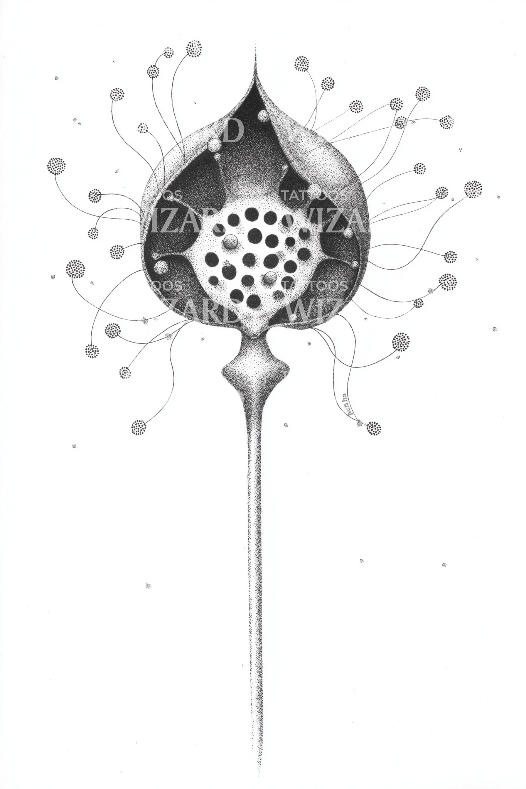 神圣的莲蓬以点描技法呈现,花瓣托起一簇星座般的种子;细腻的丝状体如呼吸般环绕。象征静水潜能、韧性与觉醒。佩戴如同一则静谧的咒语,兼具植物与精神意义。适合位置:胸骨处以求平衡,脊柱处以促流动,前臂处以内省,小腿处以延展。