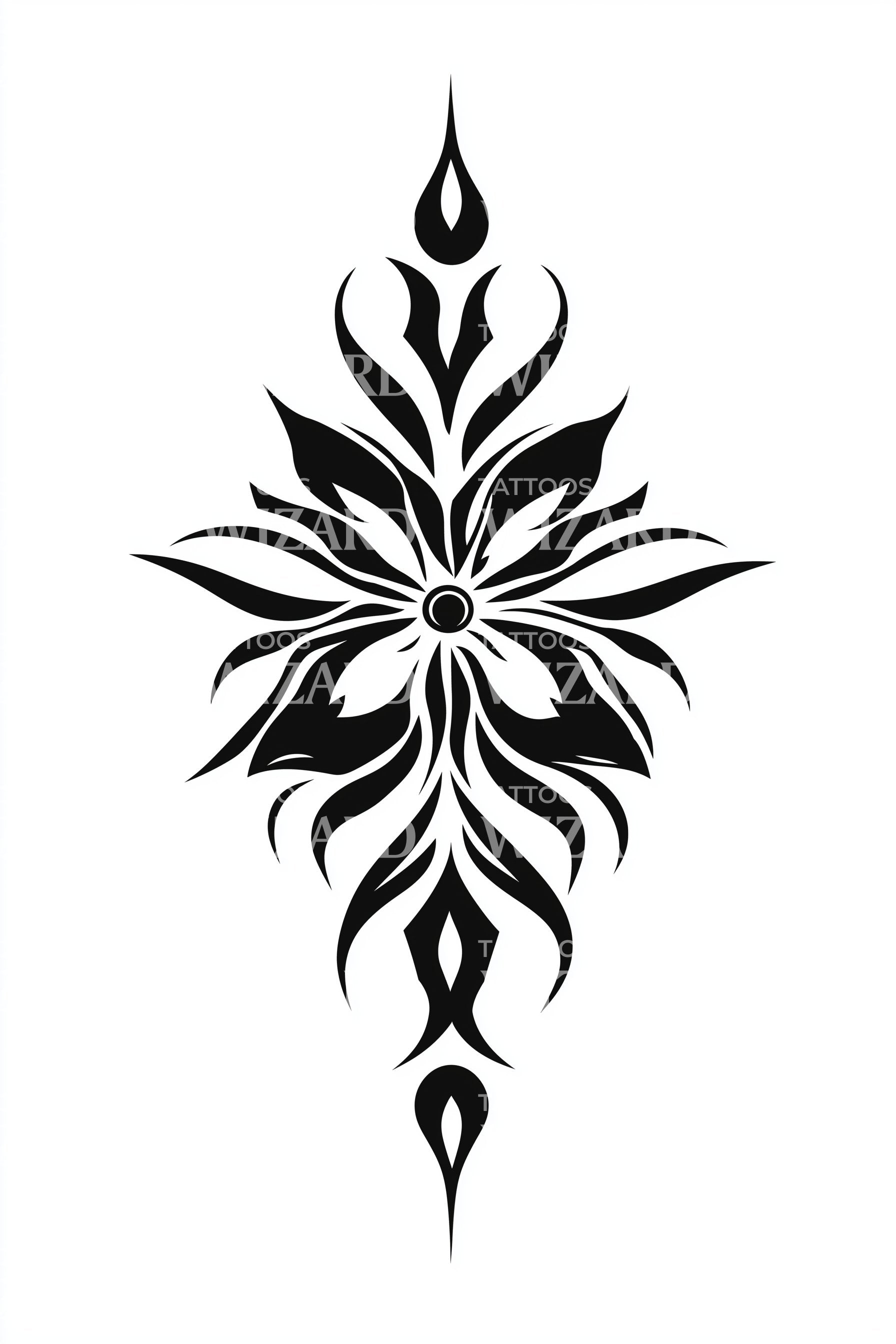 沉浸于这款黑灰纹身设计所蕴含的深刻象征意义。精致的装饰性与丰富的内涵相结合,将莲花的宁静之美与神秘符号的神秘感融为一体。其花卉元素增添了温柔的气息,使这款设计成为优雅与象征意义的迷人融合。