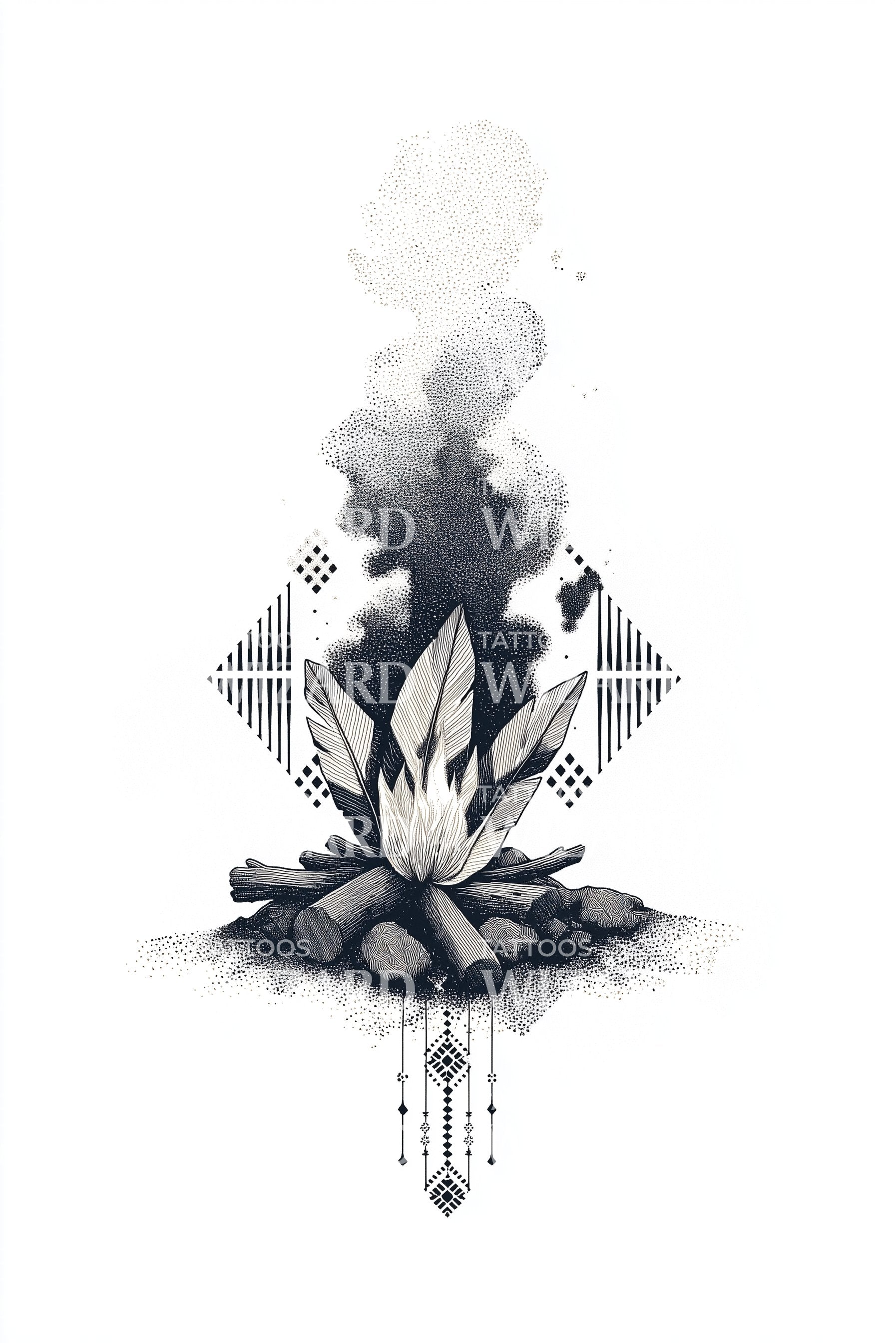 Embers bloom into a lotus within a campfire, framed by precise geometric diamonds and linework, with soft dotwork smoke ascending. The sacred marriage of earth and air symbolizes renewal and balance, a quiet ritual of resilience. Wearing it feels grounded yet luminous, like carrying a calm hearth within.