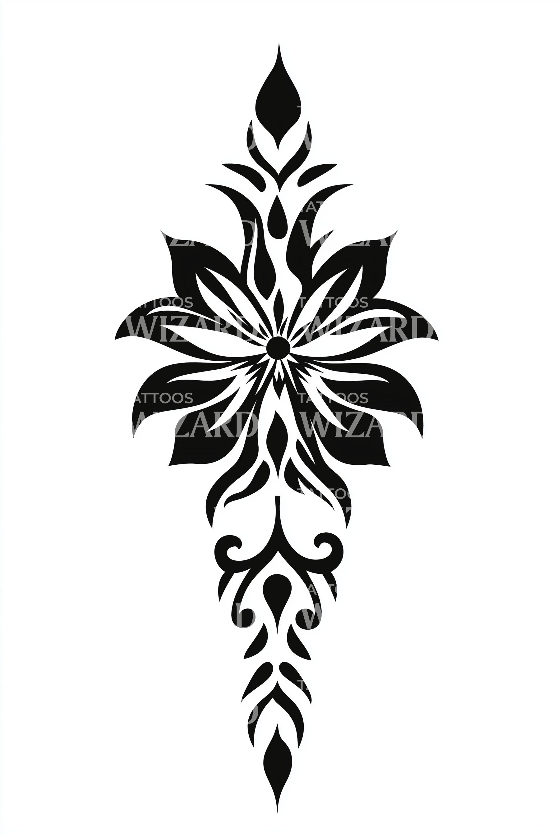 沉浸于这款黑灰纹身设计的神秘魅力。将莲花与长矛元素融合于惊艳的装饰图案中,这件竖向作品以对称之美为核心。散发力量与宁静,它是深刻刻画于你肌肤画布上的强大艺术象征。