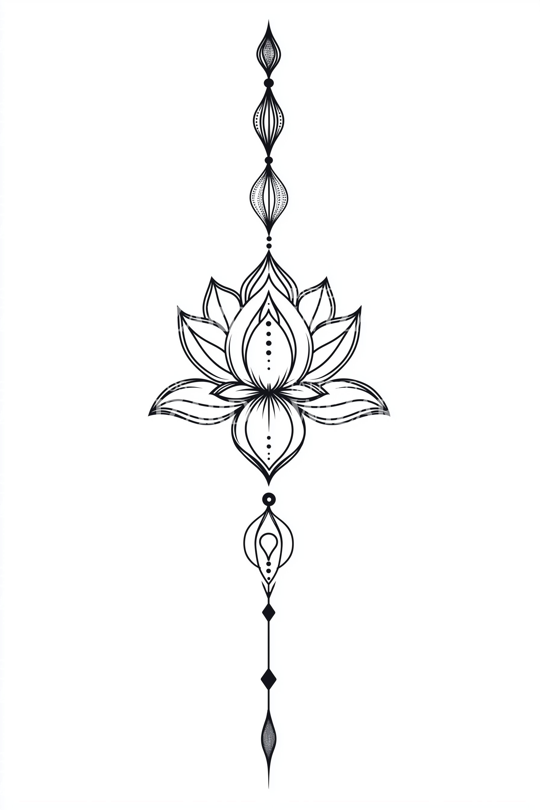 释放你内心的禅意,尽在我们的装饰性纹身设计。这款垂直作品将莲花与法杖融合成异域图腾,象征智慧与觉悟。其精致的装饰细节增添了迷人的魅力,非常适合追求独特宁静与力量表达的人士。