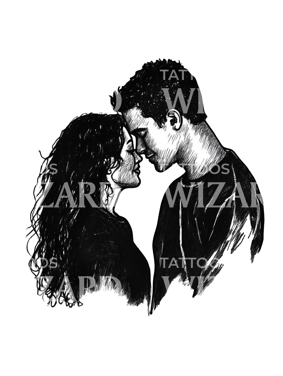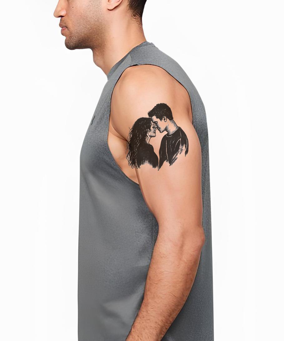 沉浸在这款黑灰色纹身设计的永恒爱情寓言中,展现了一对热情的情侣在浪漫的拥抱中。精美的艺术作品捕捉了永恒激情的本质,精心制作了一个值得永远珍藏的爱情感人致敬。用这个重要的奉献象征提升你的风格指数。