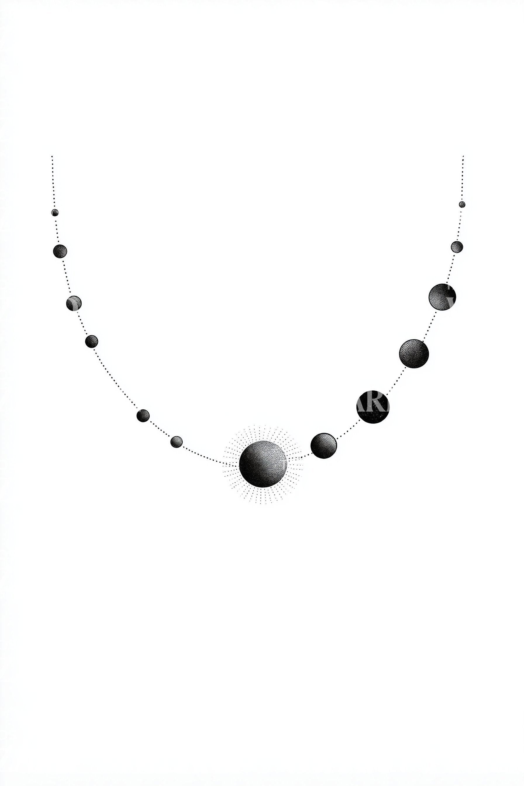 Lunar necklace rendered in delicate dotwork, a crescent arc of stippled orbs and a radiant full moon. Each phase traces renewal, intuition, and the quiet pull of tides, a celestial rosary of time. Worn close to the heart, it feels serene, grounding, and softly luminous, celebrating minimal grace.