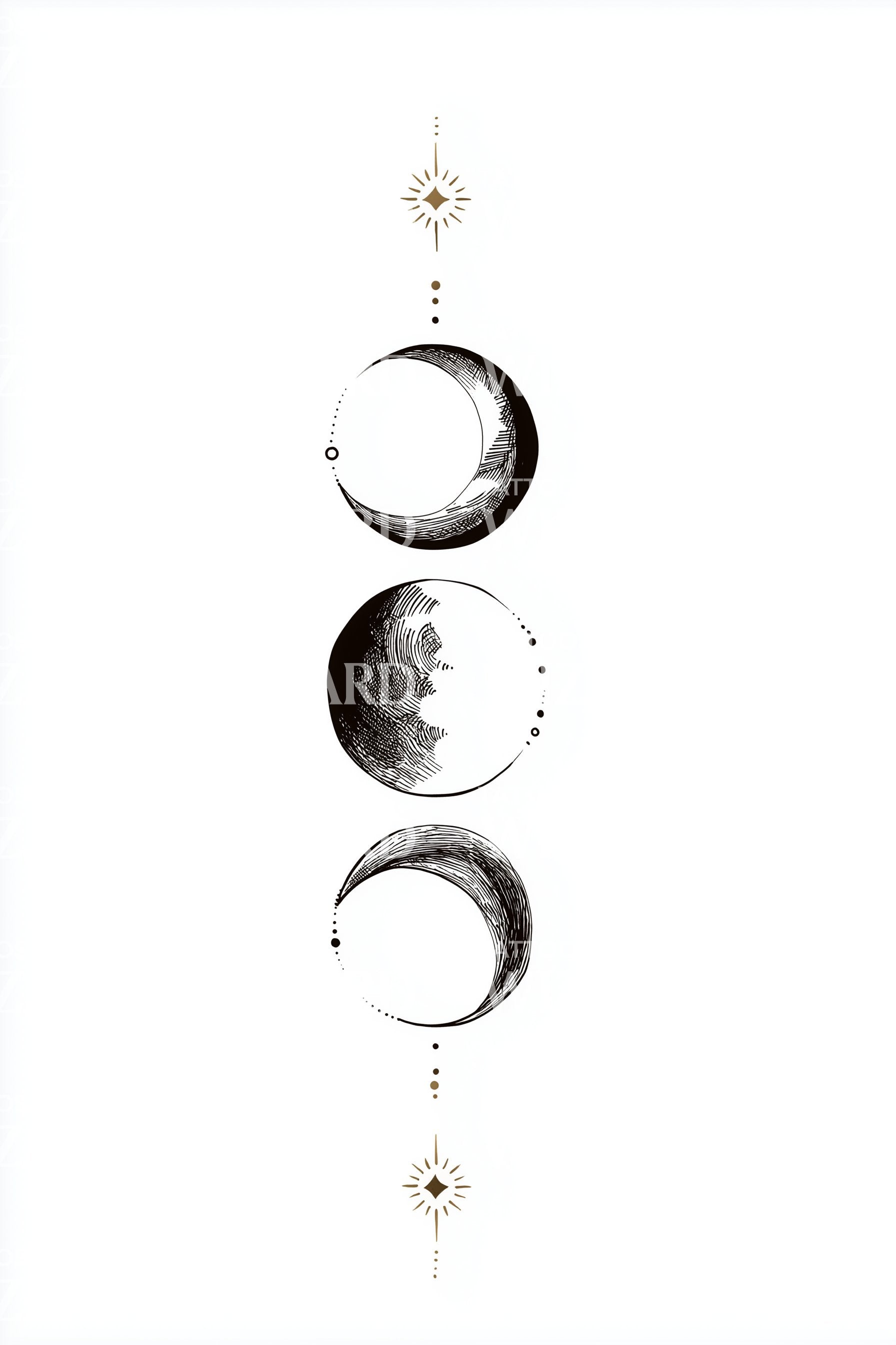 拥抱这款几何纹身设计中的天体魔法。它优美地表达了月亮的周期和阶段,捕捉了月亮的空灵本质。非常适合对巫术或天文学感兴趣的人,这件作品呈现了自然节奏与艺术诠释的神秘结合。
