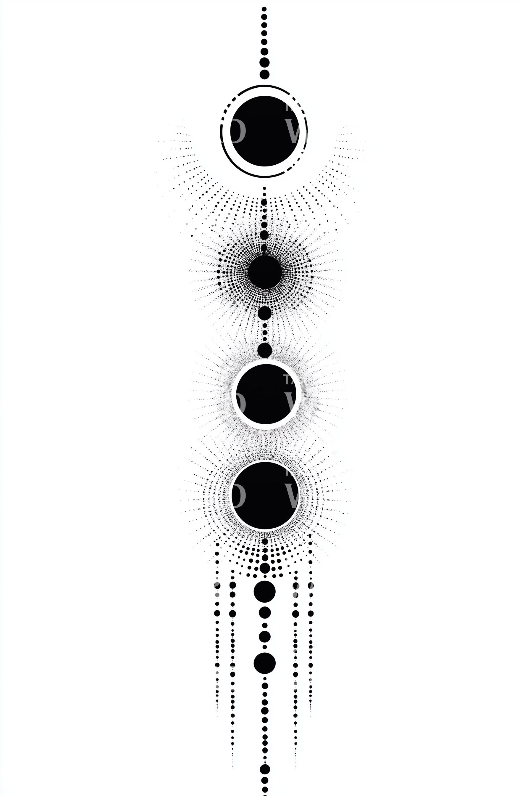 Celestial column in refined dotwork: bold lunar discs crowned by radiant halos, linked by cascading dots like an orbit at night. Each phase honors cycles, renewal, and quiet power. Wearing it feels aligned and luminous, a steady tide of breath and intention guiding your evolving path with grace.