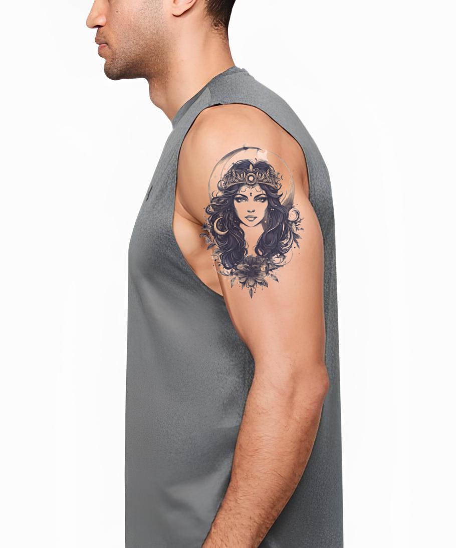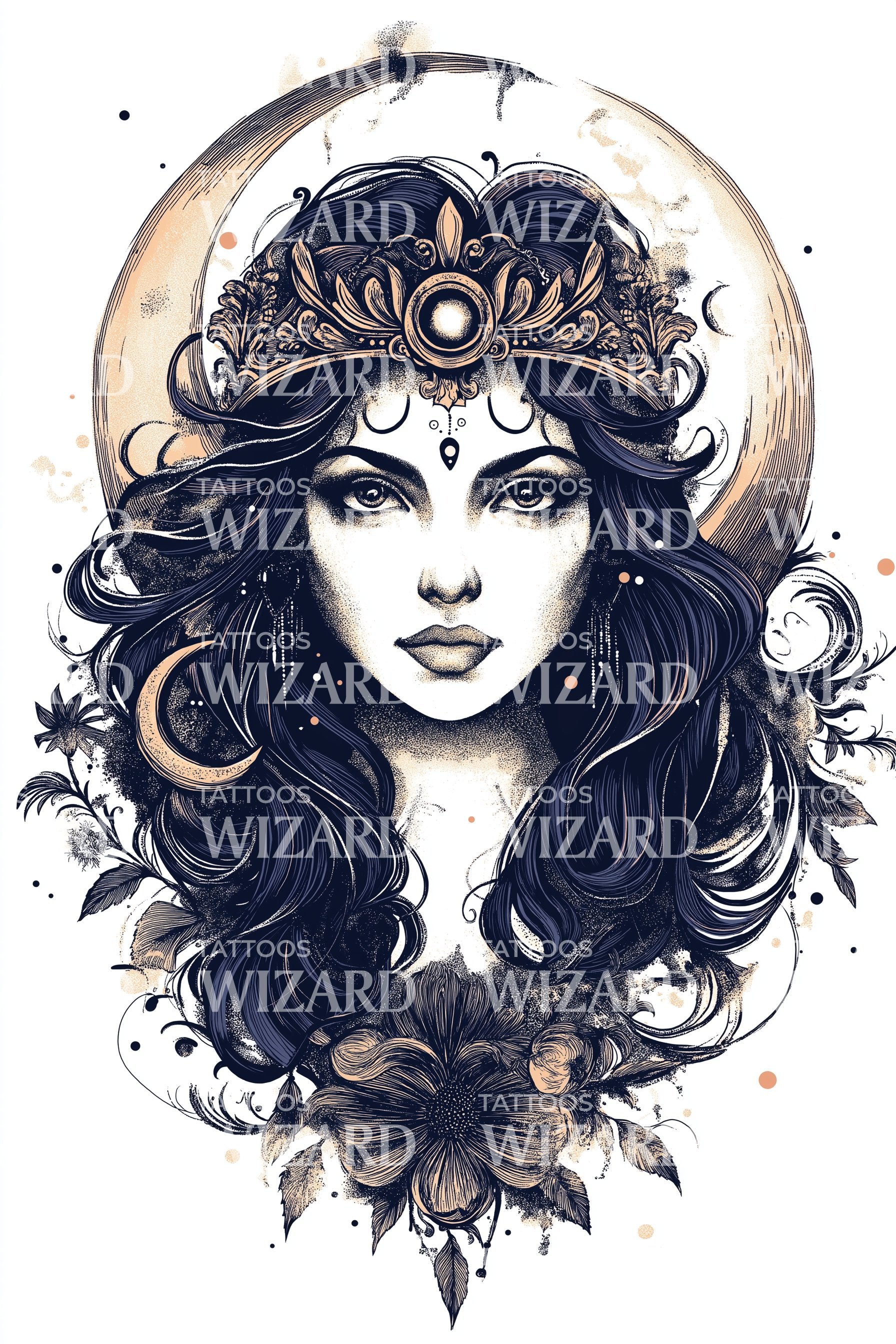 沉浸于这款富有魅力的插画纹身设计中。这幅神奇的肖像描绘了一位头戴月亮魔法冠冕的女巫,背景是神秘的月亮,令人惊叹。它是展示你对神秘与天体热爱的绝佳方式,专为那些被迷人的夜空神秘所吸引的人而设计。