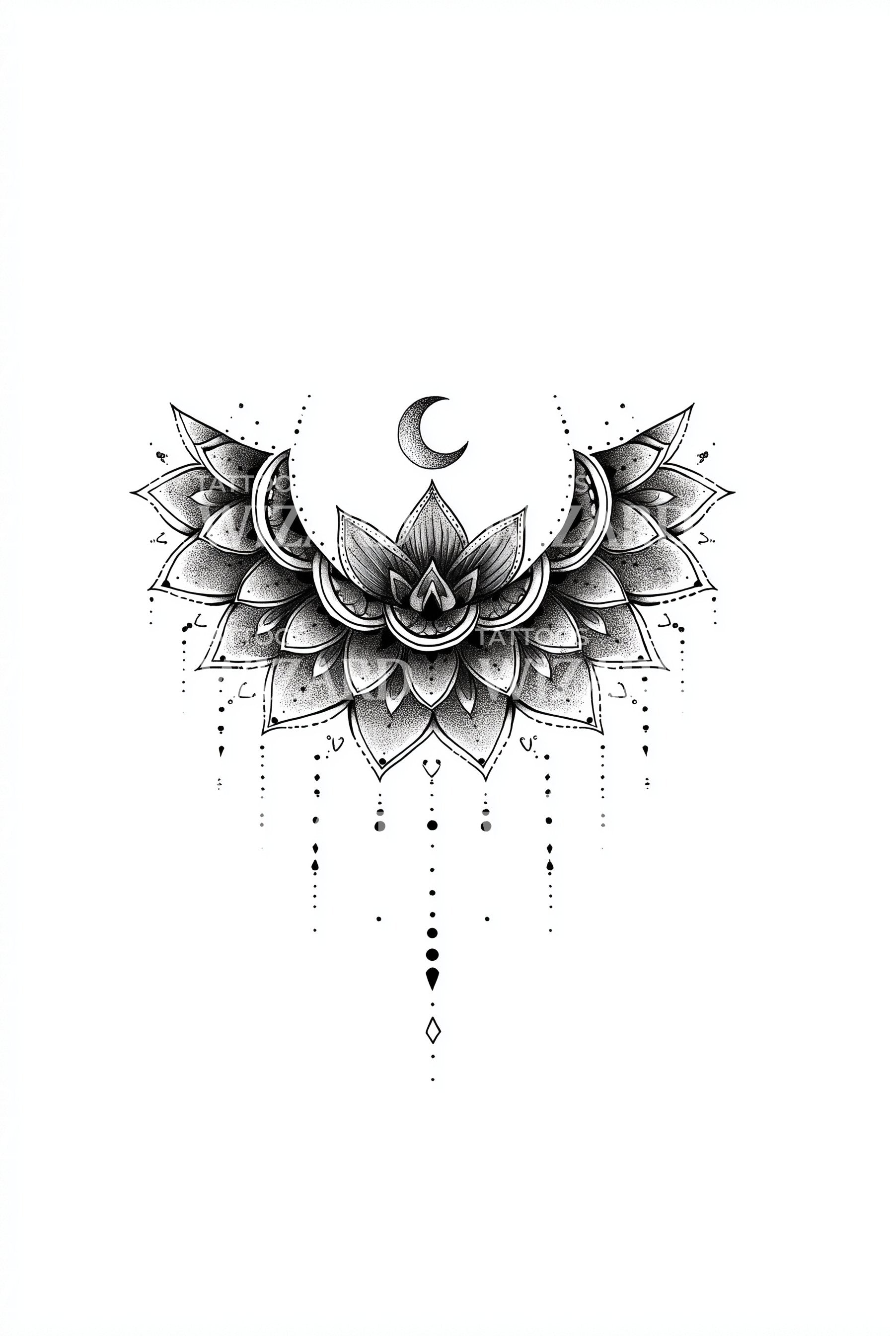 Moonlit lotus spreads winged petals in symmetrical dotwork, crowned by a crescent and jeweled drips. The lunar arc holds cycles, intuition, and rebirth, while the lotus rises in clarity. Worn as an emblem, it breathes calm courage, celestial poise, and sacred self-alignment. Ornamental guardian of mystic grace within.