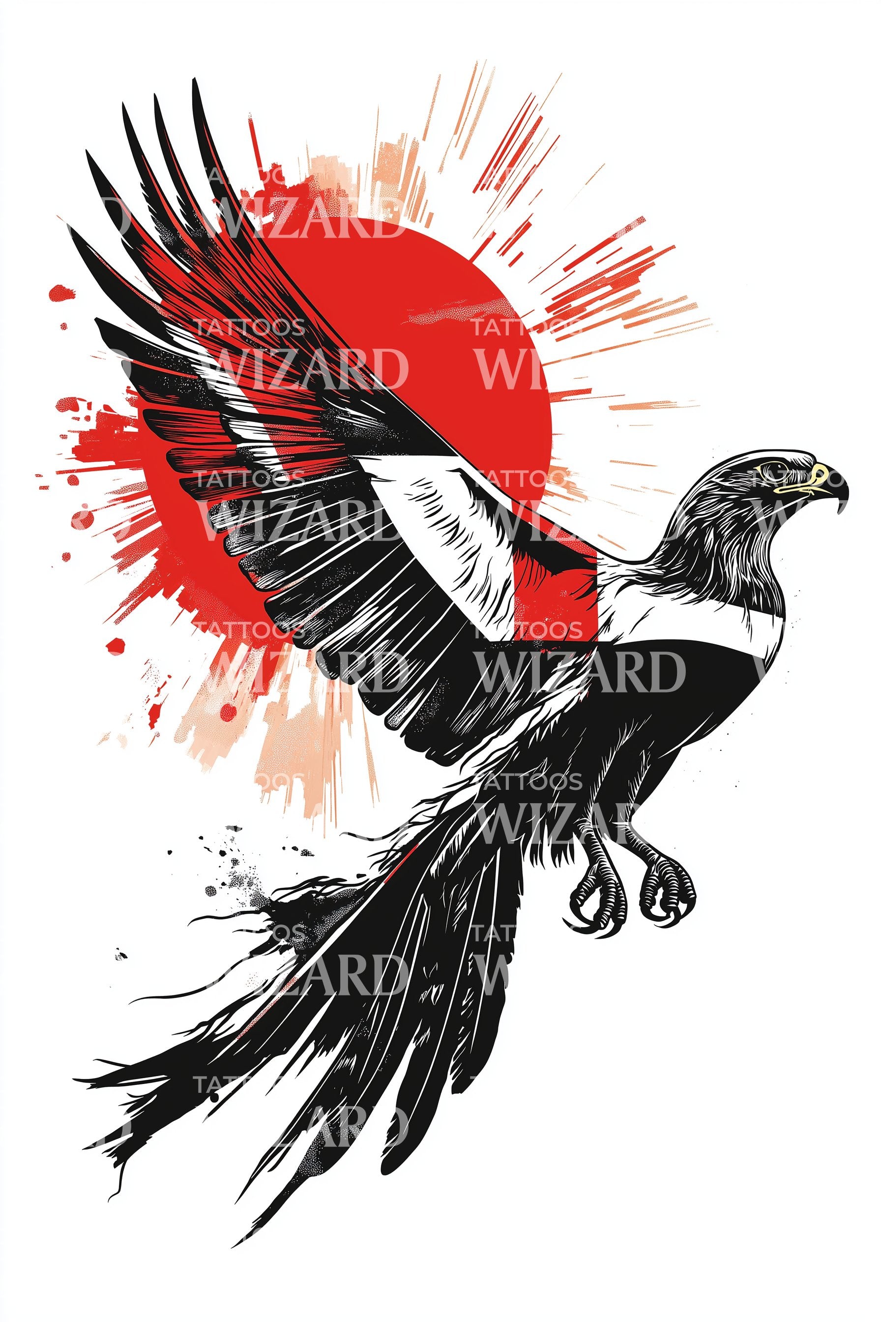 释放你的灵魂,这款戏剧性的墨水素描纹身设计描绘了一只飞翔的喜鹊。向日本美学致敬,展现了鸟儿在炽热红日下翱翔的景象。原始的强烈与细腻的细节融合,将彰显你大胆独特的个性。