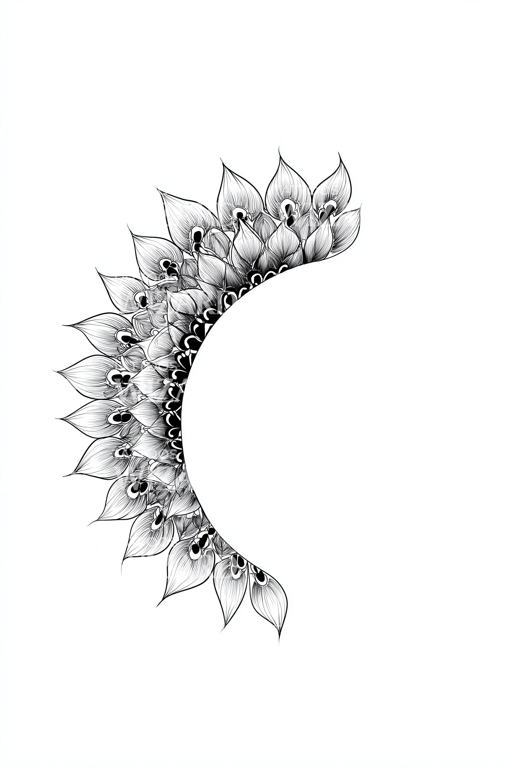 Crescent mandala blooms in layered petals, fine linework and tiny bead-like drops, curving like moonlight. Symbolizes cycles, intuition, and renewal; each petal radiates centered harmony, each bead a whispered intention. Worn close, it feels calm, delicate, and boho-chic, a protective lunar ornamental charm guiding quiet, radiant growth.