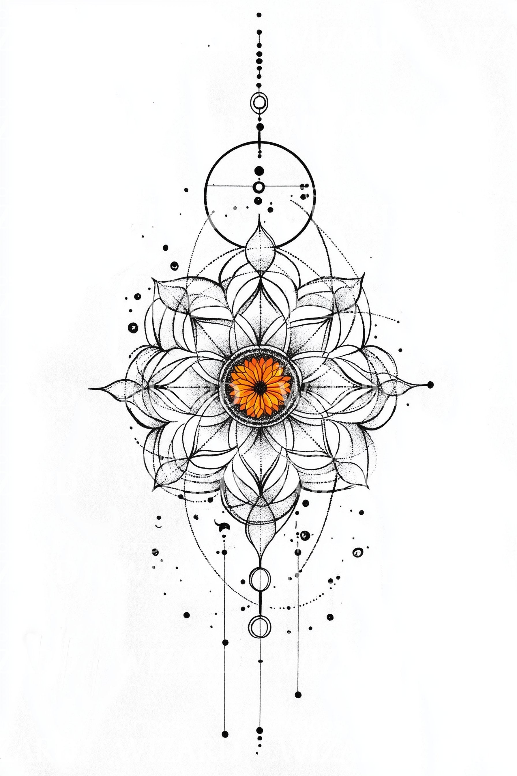 沉浸于神圣几何的美丽之中,这款装饰性曼陀罗纹身设计以迷人的橙色调展现其精致细节。灵感源自古老的精神象征,这一设计宛如一枚吊坠,为您的纹身艺术收藏增添持久魅力。